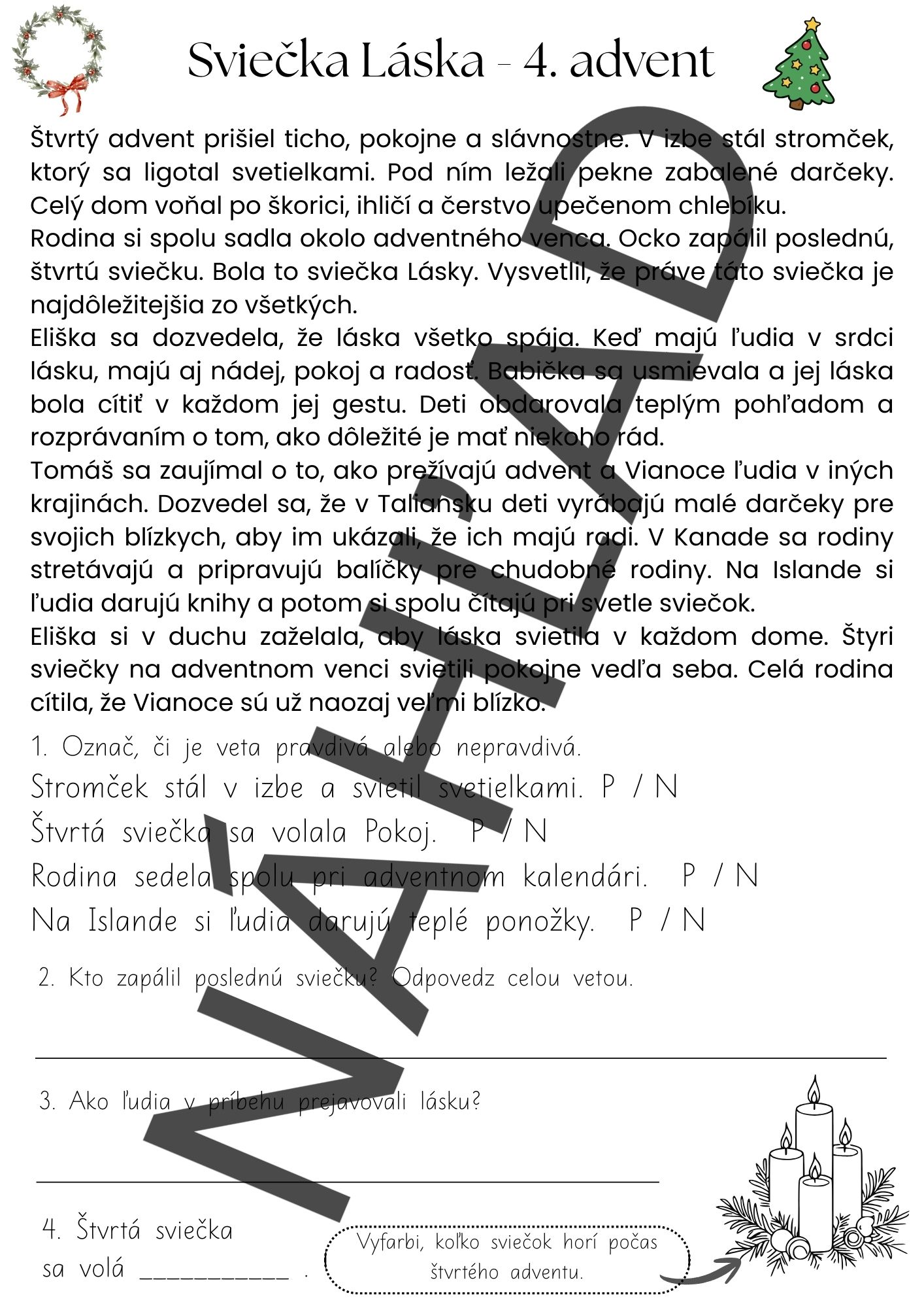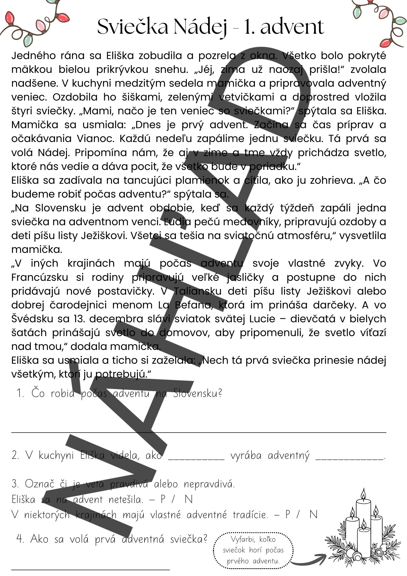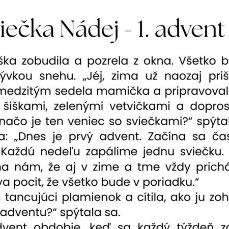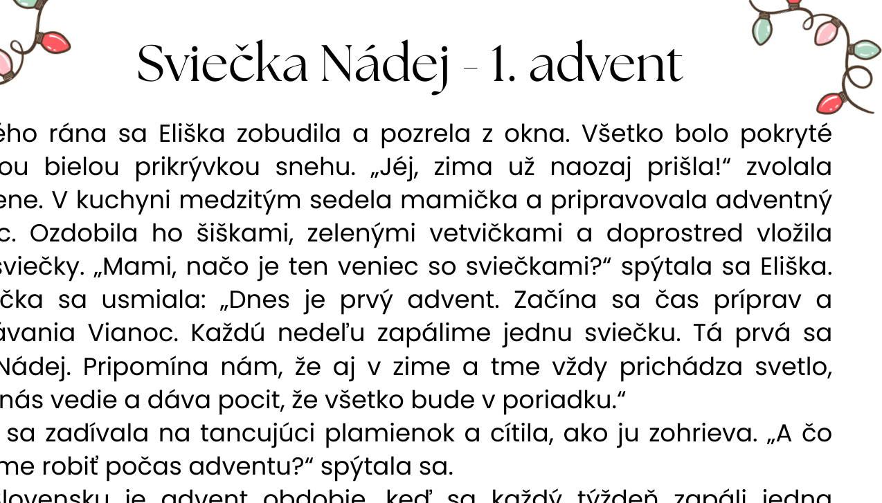Súbor obsahuje štyri tematické príbehy (4 pracovné listy) viažuce sa k jednotlivým adventným nedeliam. Každý príbeh predstavuje jednu adventnú sviečku – Nádej, Mier, Radosť a Lásku – a prirodzene približuje deťom význam adventu, rodinné tradície a hodnoty dobra, pomoci a spolupatričnosti.