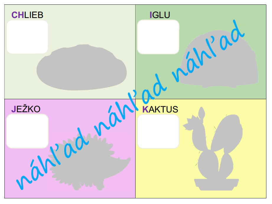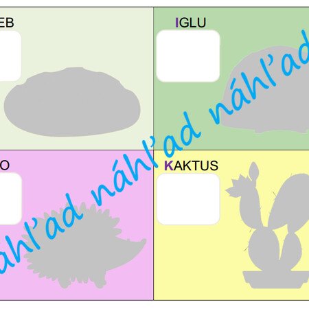 PDF obsahuje 7 A4. Na každej A4 sú 4 písmená s tieňom na obrázok podľa písmena, názov obrázka a okienko na písmeno z abecedy.