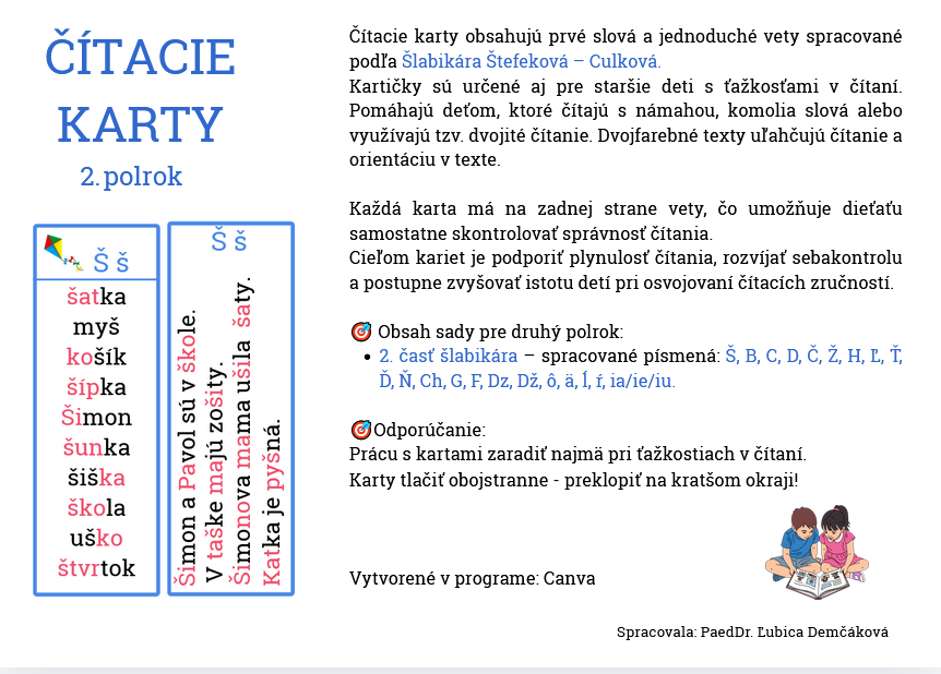 Čítacie karty ponúkajú prvé slová a jednoduché vety, ktoré sú spracované v súlade so Šlabikárom Štefeková – Culková. Sú vhodné nielen pre začiatočníkov, ale aj pre staršie deti, ktoré majú problémy s čítaním. Pomáhajú žiakom čítajúcim s námahou, tým, ktorí slová skomolia alebo používajú tzv. dvojité čítanie. Dvojfarebné prevedenie textov uľahčuje orientáciu v texte a podporuje plynulosť čítania.