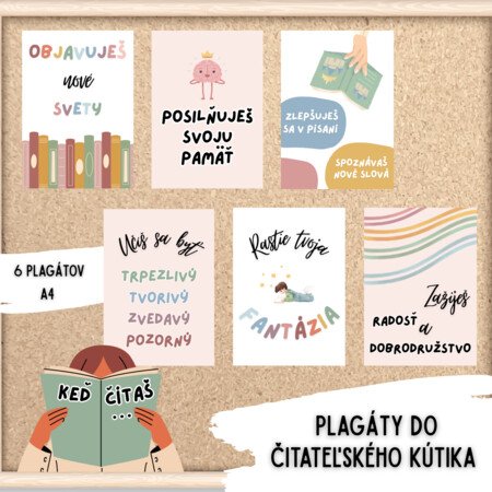 Súbor obsahuje 6 motivačných plagátov s krátkymi heslami, ktoré podporujú pozitívny vzťah žiakov k čítaniu. Prispievajú tiež k vytvoreniu príjemného a podnetného čitateľského prostredia.
