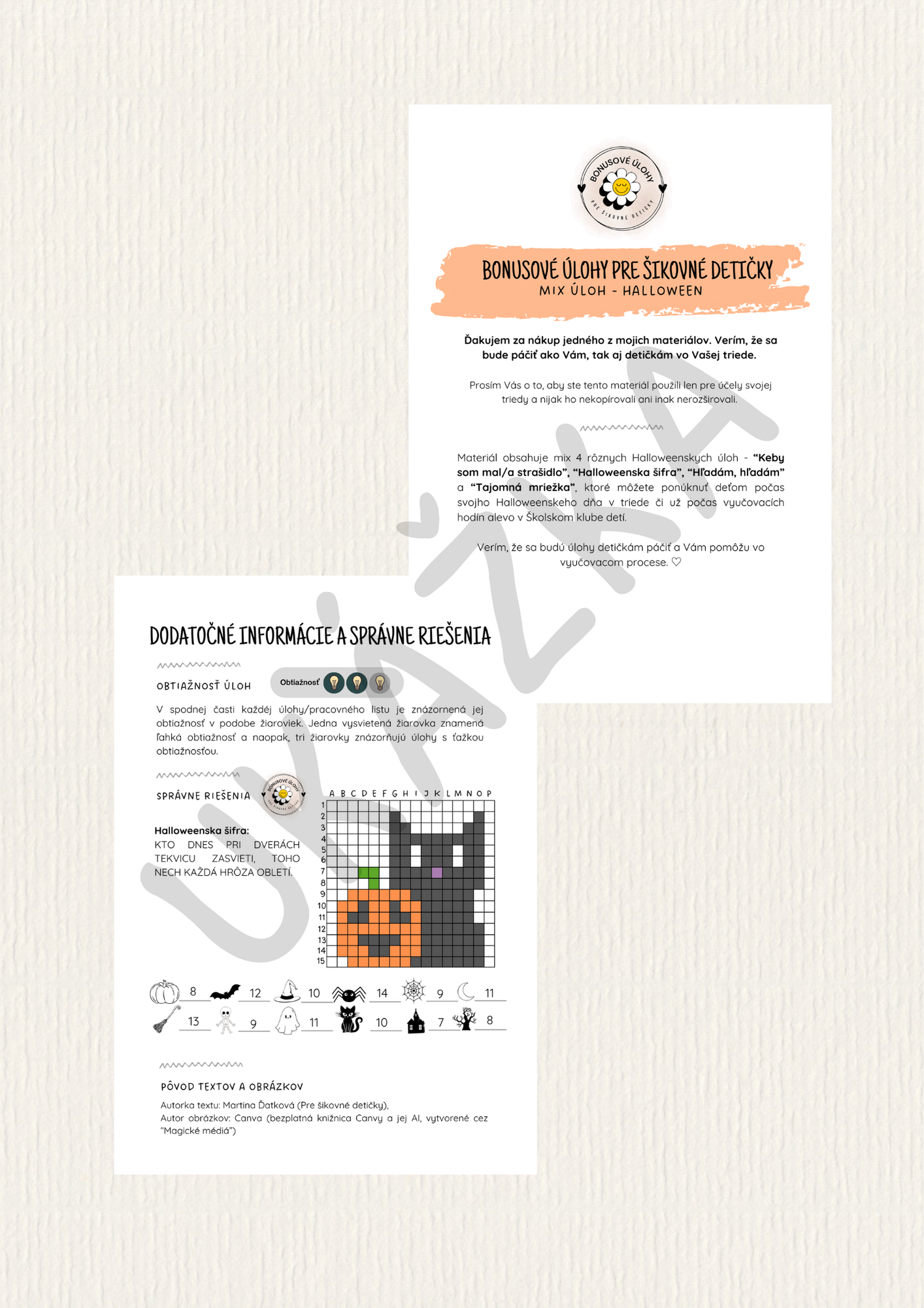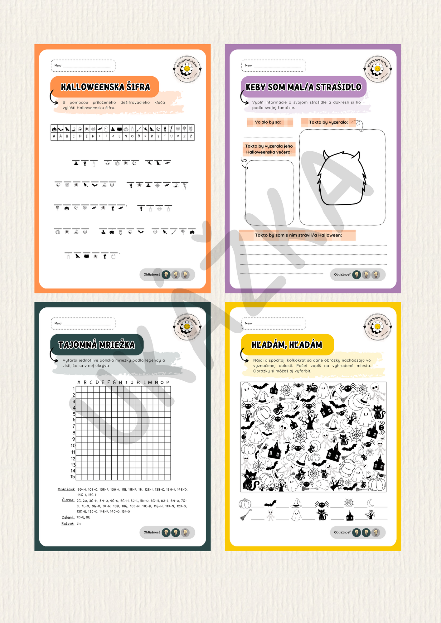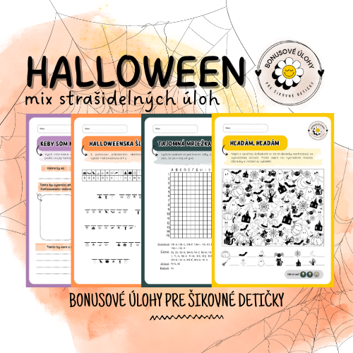 Súbor obsahuje 4 rôzne Halloweenske úlohy, ktoré sú vhodné na využitie počas Vášho Halloweenskeho dňa v triede. Je ich možné využiť ako doplnkovú či bonusovú úlohu pre detičky, ktoré už skončili so zadanou prácou. Sú vhodné pre rozvoj fantázie i tréning pozornosti.