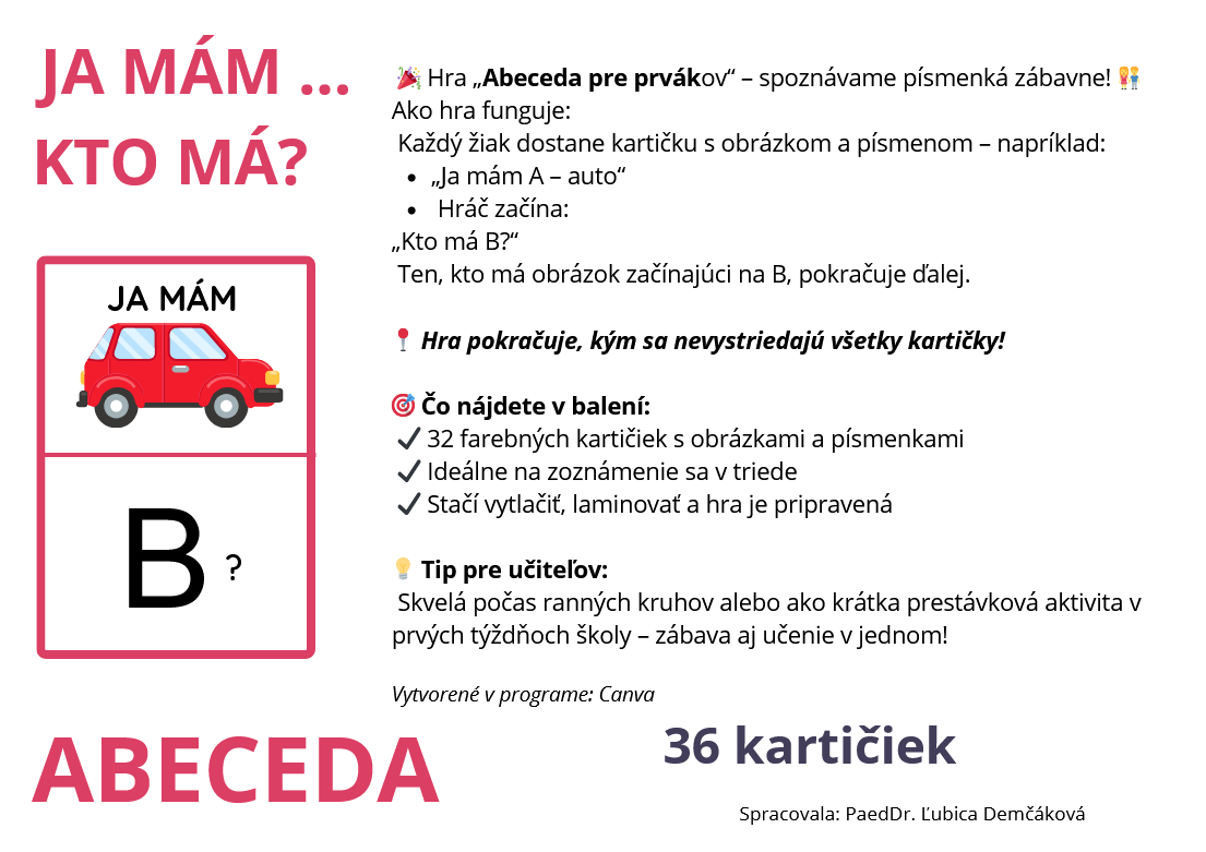 🎉 Hra „Abeceda pre prvákov“ – spoznávame písmenká zábavne! 👫Ako hra funguje:Každý žiak dostane kartičku s obrázkom a písmenom – napríklad:„Ja mám A – auto“Hráč začína:„Kto má B?“Ten, kto má obrázok začínajúci na B, pokračuje ďalej.📍 Hra pokračuje, kým sa nevystriedajú všetky kartičky! 🎯 Čo nájdete v balení:✔ 32 farebných kartičiek s obrázkami a písmenkami✔ Ideálne na zoznámenie sa v triede✔ Stačí vytlačiť, laminovať a hra je pripravená 💡 Tip pre učiteľov:Skvelá počas ranných kruhov alebo ako krátka prestávková aktivita v prvých týždňoch školy – zábava aj učenie v jednom!
