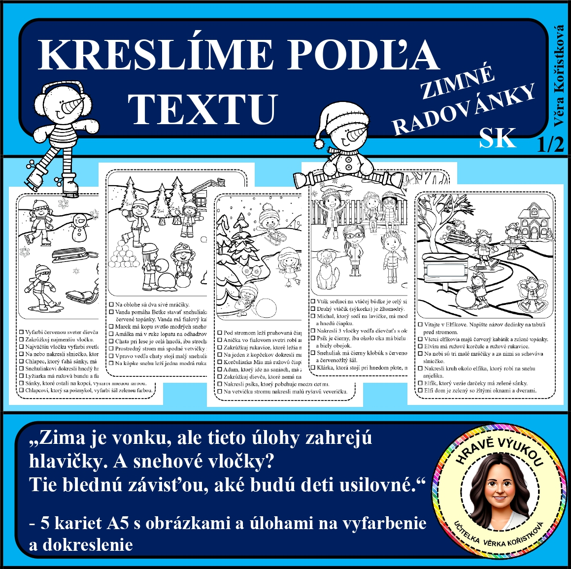 Obsahuje 5 listov A5 (2× na A4) so zimnou ilustráciou s deťmi a sadou úloh na vyfarbovanie a dokresľovanie.