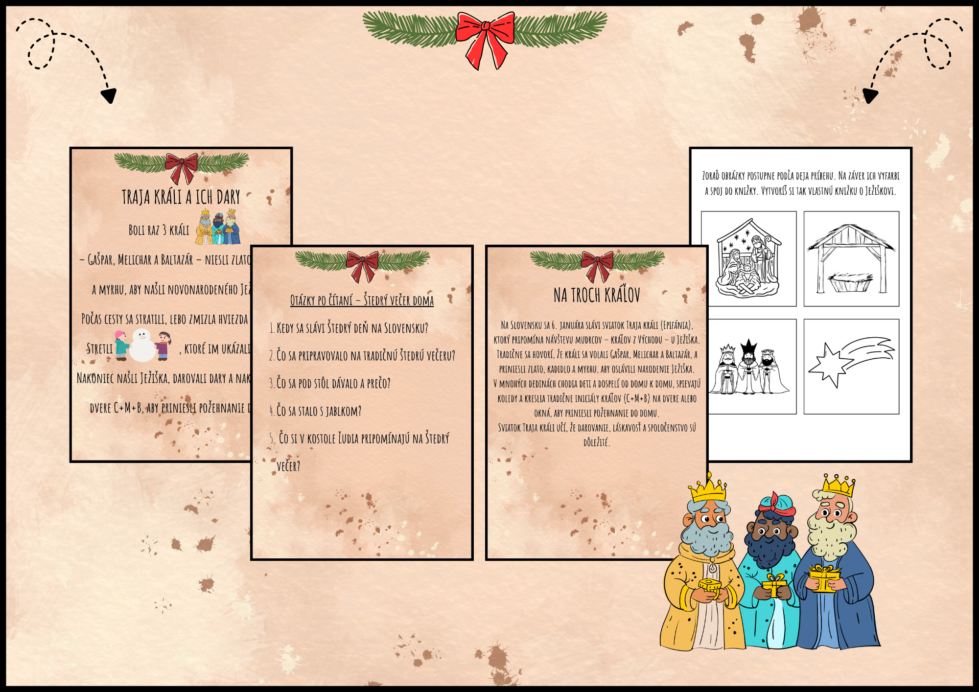 - Traja králi: príbeh Gašpara, Melichara a Baltazára, vyfarbovanie kráľov alebo C+M+B na papier, a vytvorenie malej knižky o Ježiškovi.