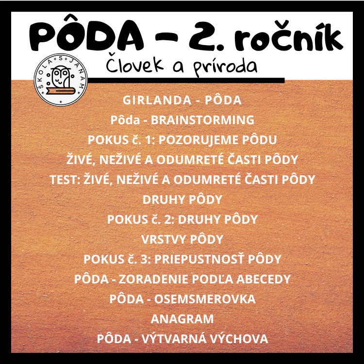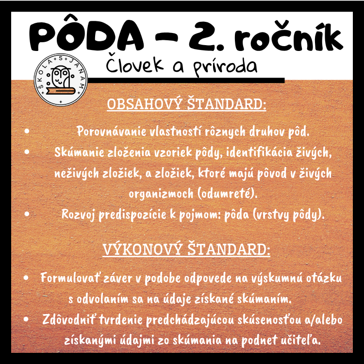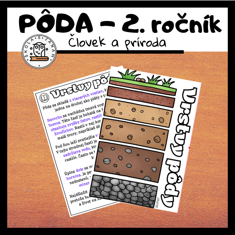 Pracovné listy sa venujú téme - Pôda - 1. cyklus - 2. ročník. Obsahuje prepojenie vzdelávacej oblasti Človek a príroda so slovenským jazykom a námet na výtvarnú výchovu. V súbore nájdete test a hodnotiacu tabuľku k testu, ktorú môžete použiť ako alternatívne hodnotenie učiteľom, s pomocou aj ako sebahodnotenie žiaka.