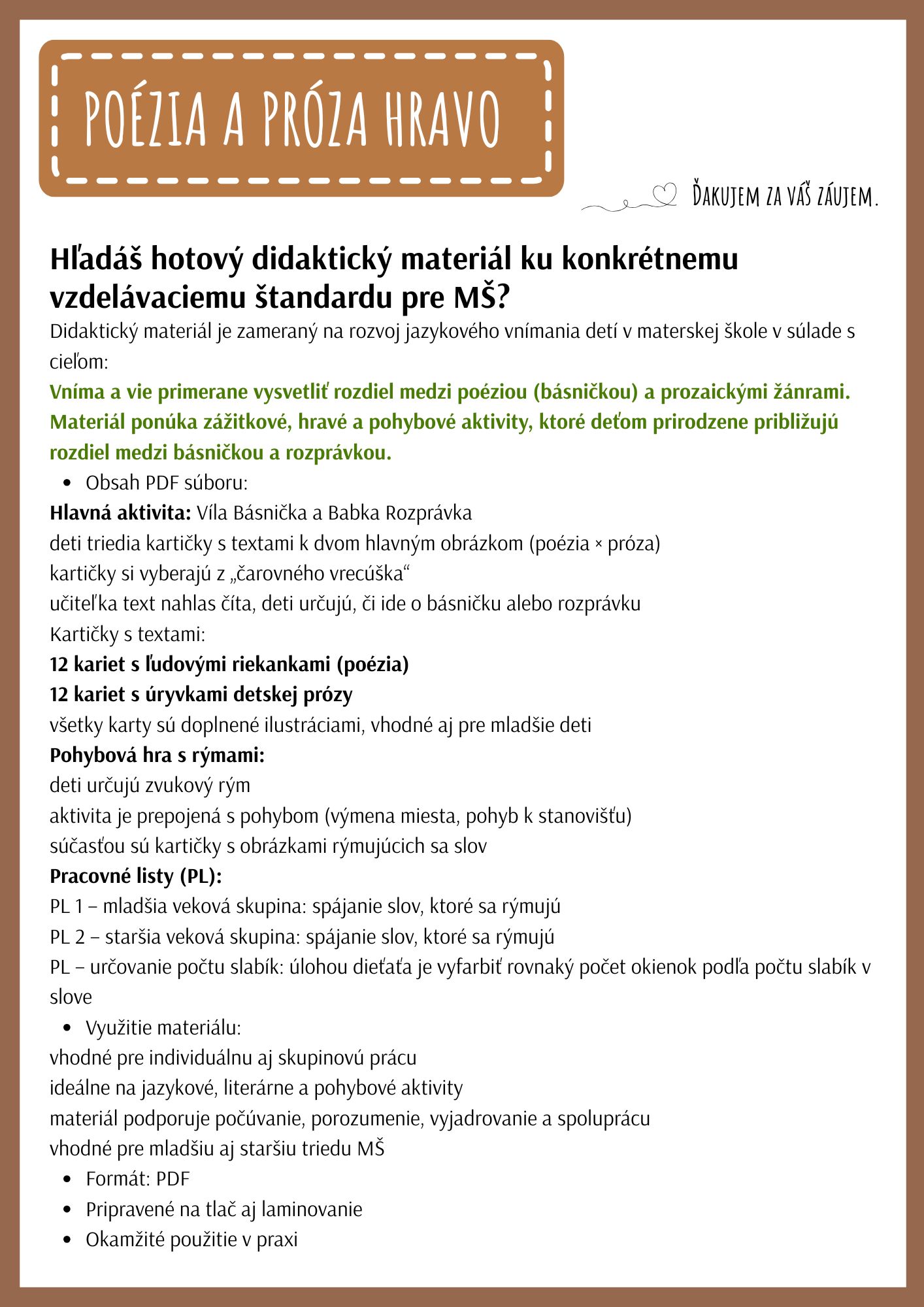 Materiál ponúka zážitkové, hravé a pohybové aktivity, ktoré deťom prirodzene približujú rozdiel medzi básničkou a rozprávkou.
