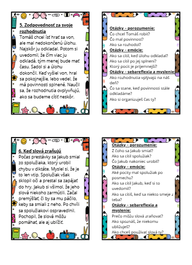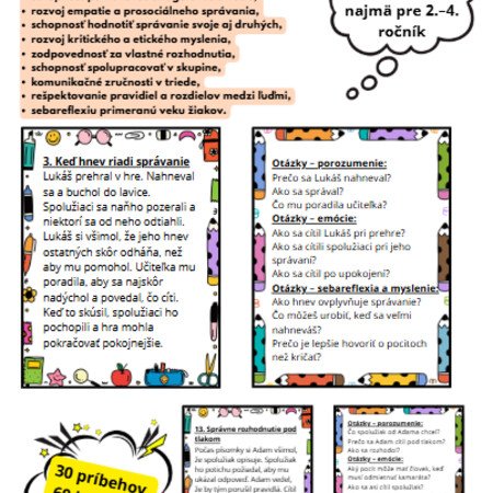 Tento edukačný materiál je určený pre učiteľov 1. stupňa základných škôl ako praktická pomôcka na podporu sociálneho a emočného rozvoja žiakov. Prostredníctvom krátkych, pedagogicky spracovaných príbehov a následných otázok vedie žiakov k porozumeniu vlastnému správaniu, emóciám a medziľudským vzťahom v triednom kolektíve.