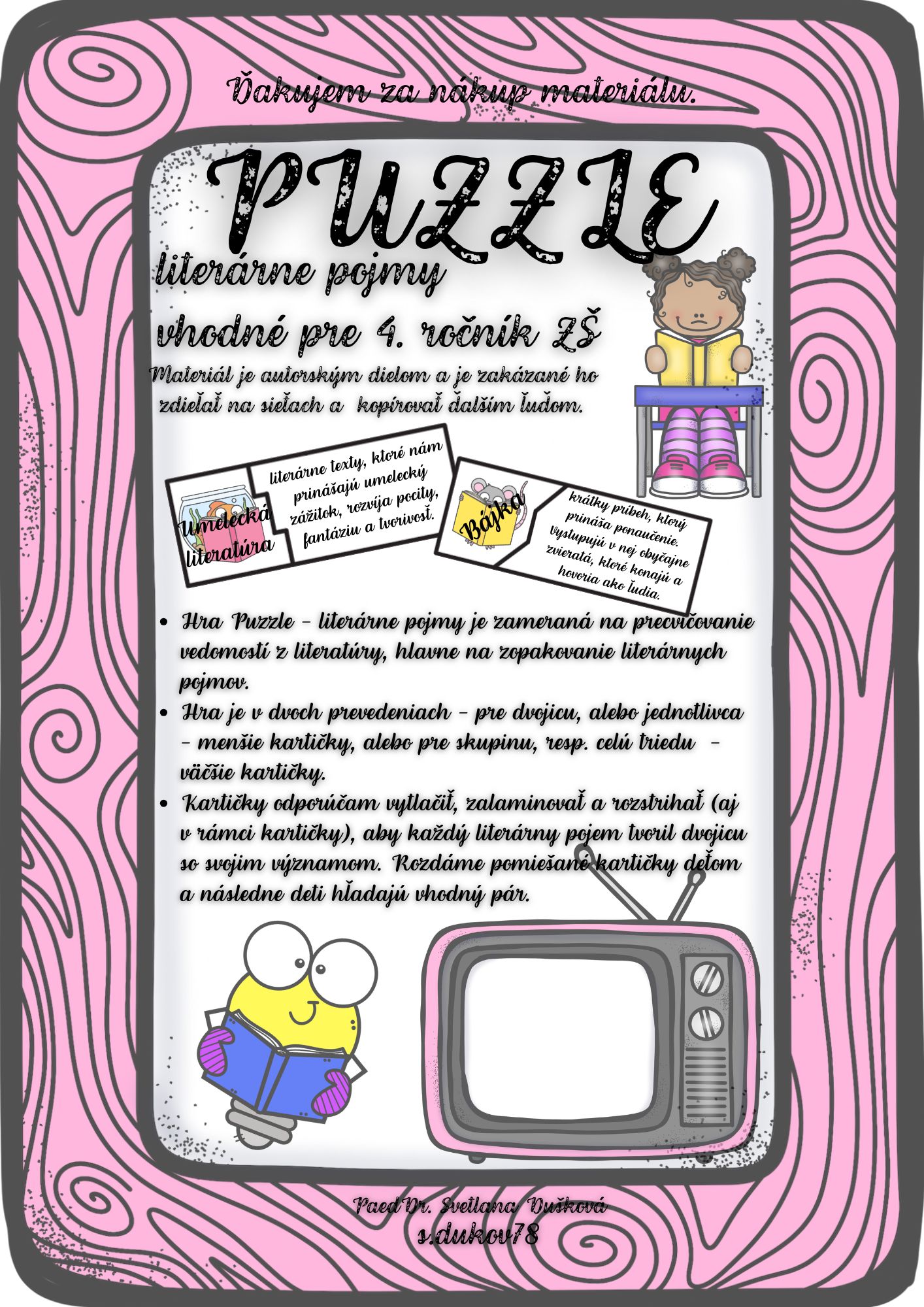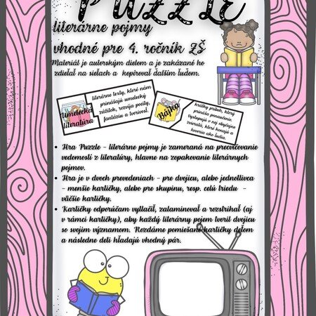 Hra je zameraná na precvičovanie vedomostí z literatúry, hlavne na zopakovanie literárnych pojmov.Hra je v dvoch prevedeniach - pre jednotlivca, alebo pre dvojicu - menšie kartičky a pre skupinu, alebo triedu- väčšie kartičky. Kartičky odporúčam vytlačiť, zalaminovať a rozstrihať ( aj v rámci kartičky) aby každý literárny pojem tvoril dvojicu so svojím významom. Rozdáme kartičky deťom, ktoré následne hľadajú vhodný pár.