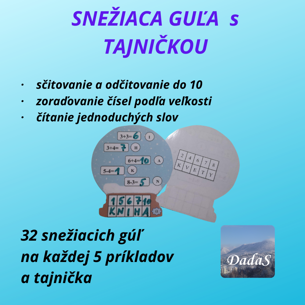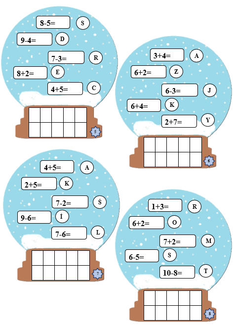 Žiak použitím suchej fixky vypočíta príklady na snehovej guli. Výsledky zoradí od najmenšieho po najväčší do tabuľky a k jednotlivým výsledkom priradí ponúknuté písmená podľa zadania. Prečíta si vzniknuté slovo. Správnosť si overí na zadnej strane karty. Prebieha sebakontrola.
