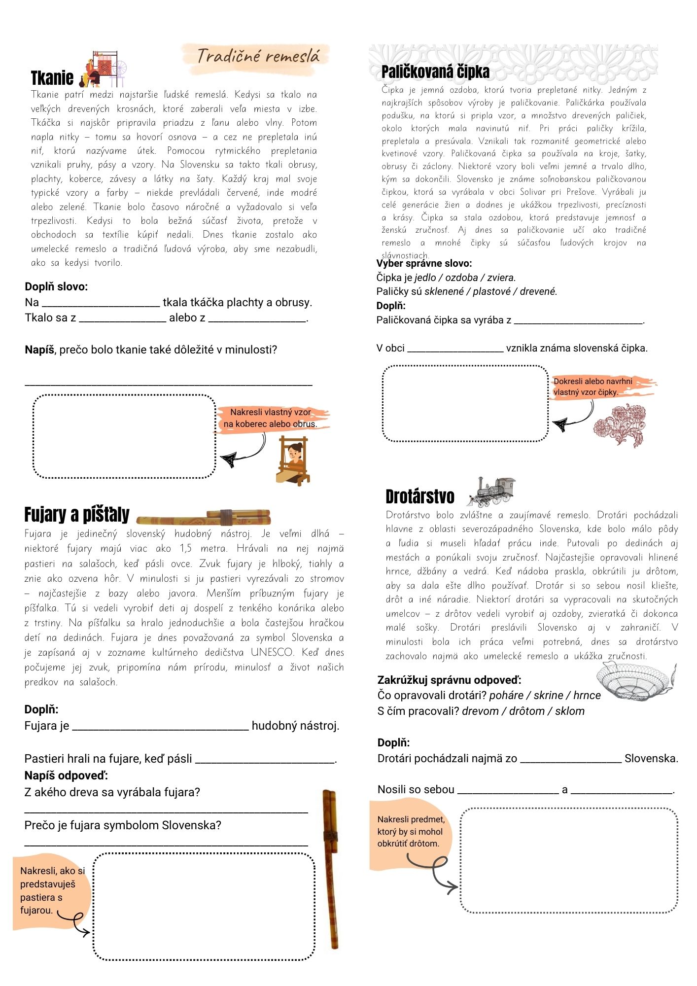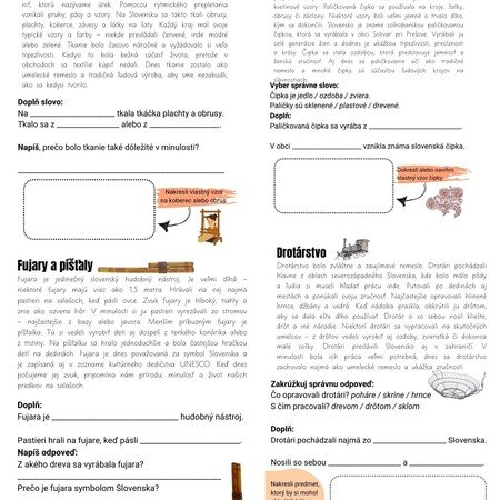Súbor pracovných listov je zameraný na spoznávanie slovenských tradičných remesiel – tkanie, paličkovaná čipka, výroba fujary a drotárstvo. Každé remeslo obsahuje krátky náučný text primeraný veku detí a rôznorodé úlohy, pomocou ktorých si žiaci upevňujú porozumenie prečítaného a zároveň tvorivo pracujú.