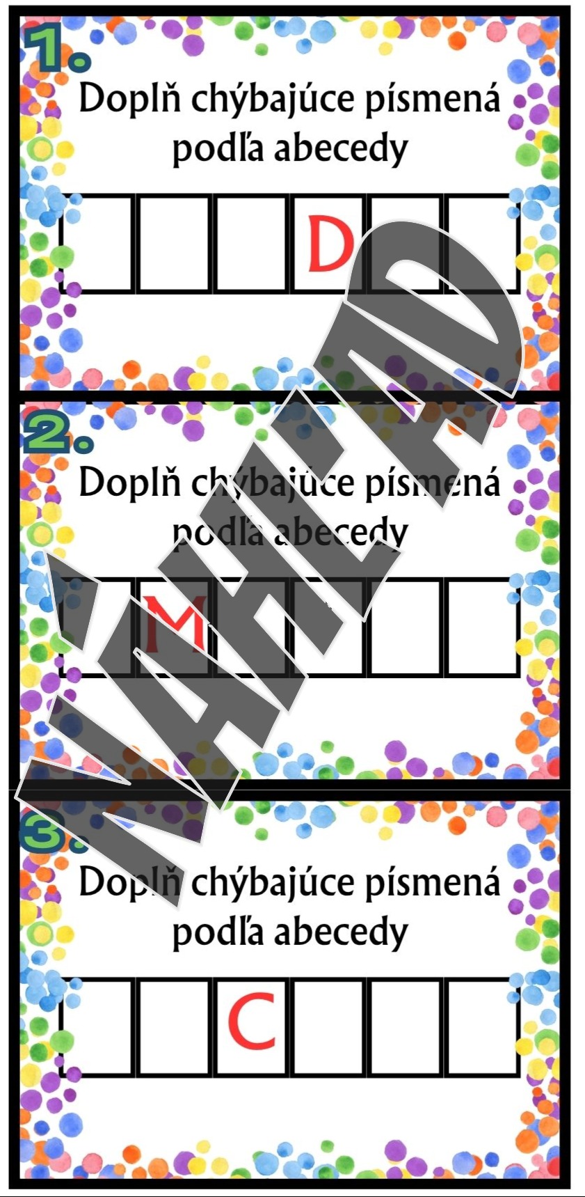 Milí kolegovia, ďakujem za Váš záujem o materiál. Vytvorila som kartičky, pomocou ktorých si žiaci môžu zopakovať abecedu. Na každej kartičke je zvýraznené písmeno a žiaci majú chýbajúce písmená doplniť podľa veľkej abecedy.