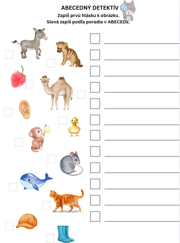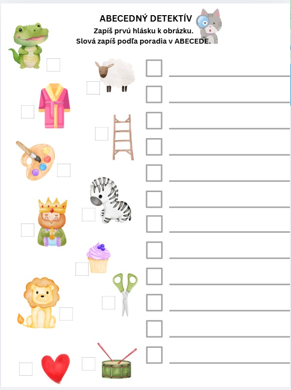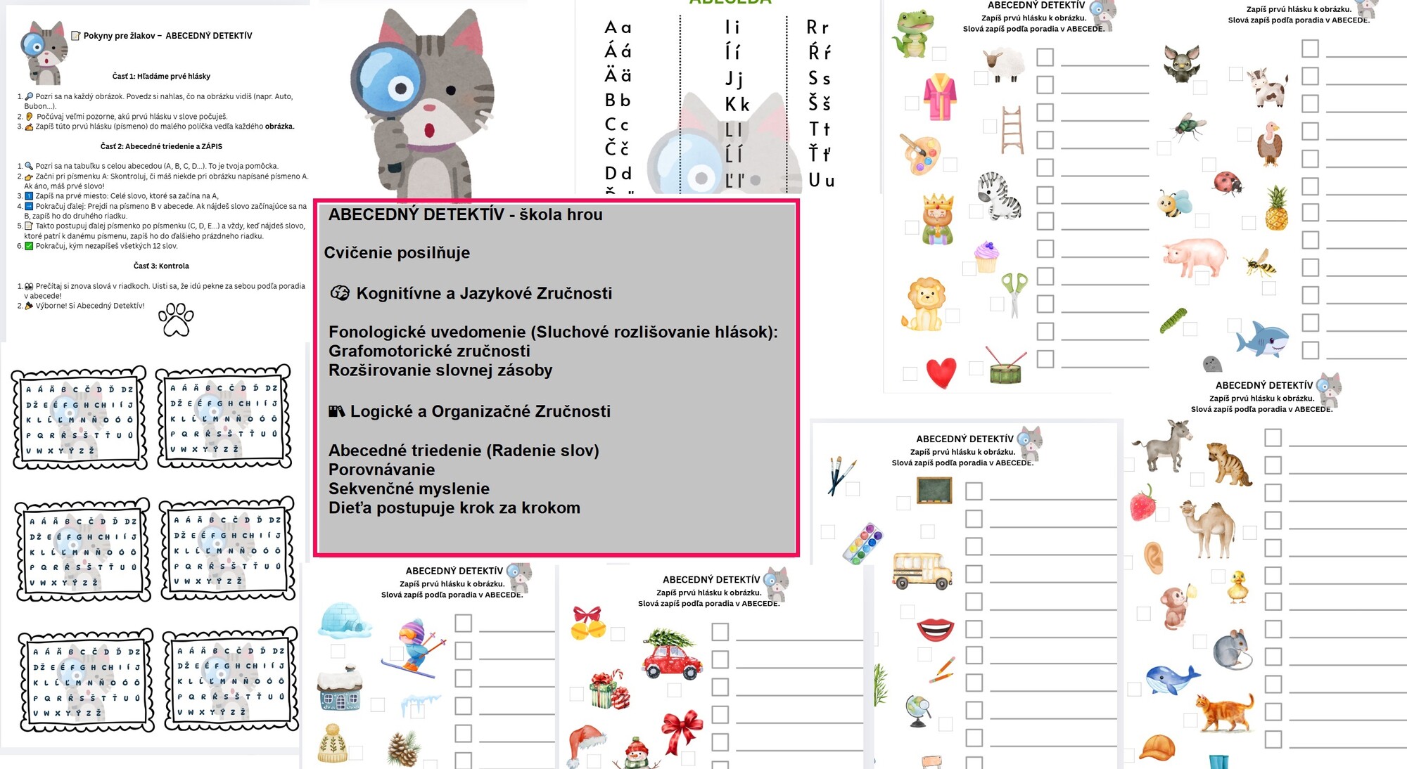 - Porovnávanie: Dieťa porovnáva prvé hlásky všetkých slov (A, B, D...) a musí ich zaradiť do správneho poradia podľa vzoru v abecede. Je to základ logického a systematického myslenia.
