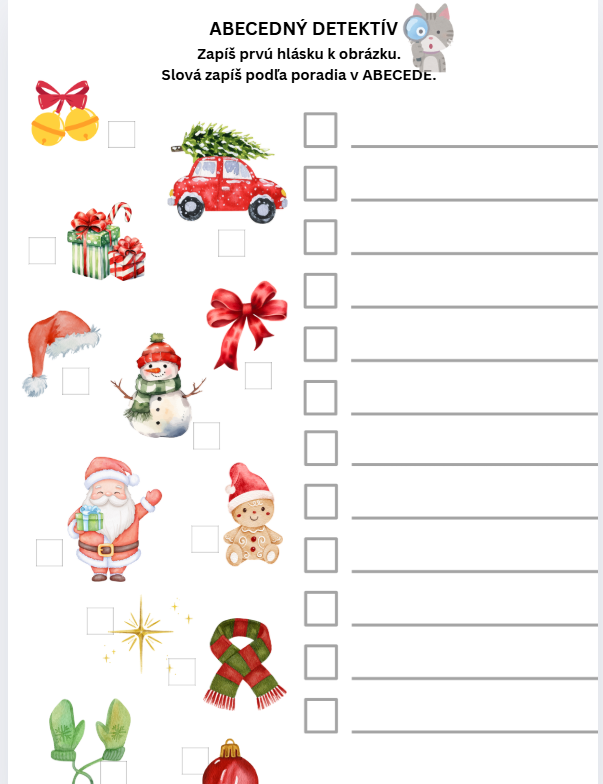 - Písanie hlásky/písmena: Dieťa musí správne napísať priradenú začiatočnú hlásku (písmeno) ku každému obrázku.