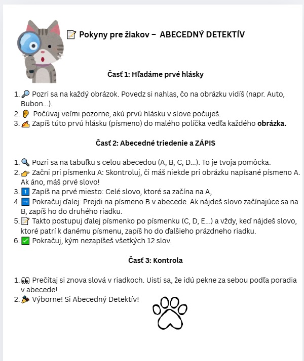 - Dieťa postupuje krok za krokom – najprv určenie hlásky, potom zoradenie, a nakoniec prepísanie slov v poradí.