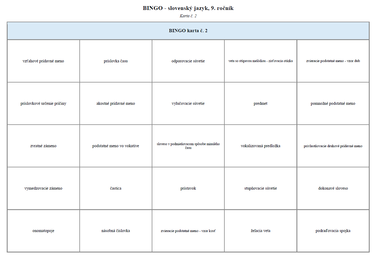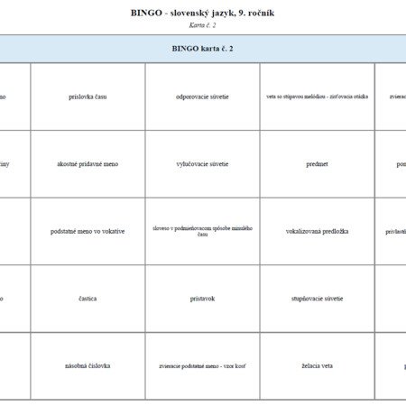Materiál je určený na opakovanie učiva zo slovenského jazyka a literatúry formou hry BINGO pre žiakov 9. ročníka. Obsahuje 12 rôznych bingo kariet, na ktorých sa nachádzajú pojmy z jazykovej, slohovej a literárnej oblasti, napríklad umelecké prostriedky, vetné členy, druhy viet, slohové útvary, literárne žánre a literárne smery. Súčasťou materiálu je aj zoznam pojmov pre učiteľa, ktorý slúži ako pomôcka pri vedení aktivity.