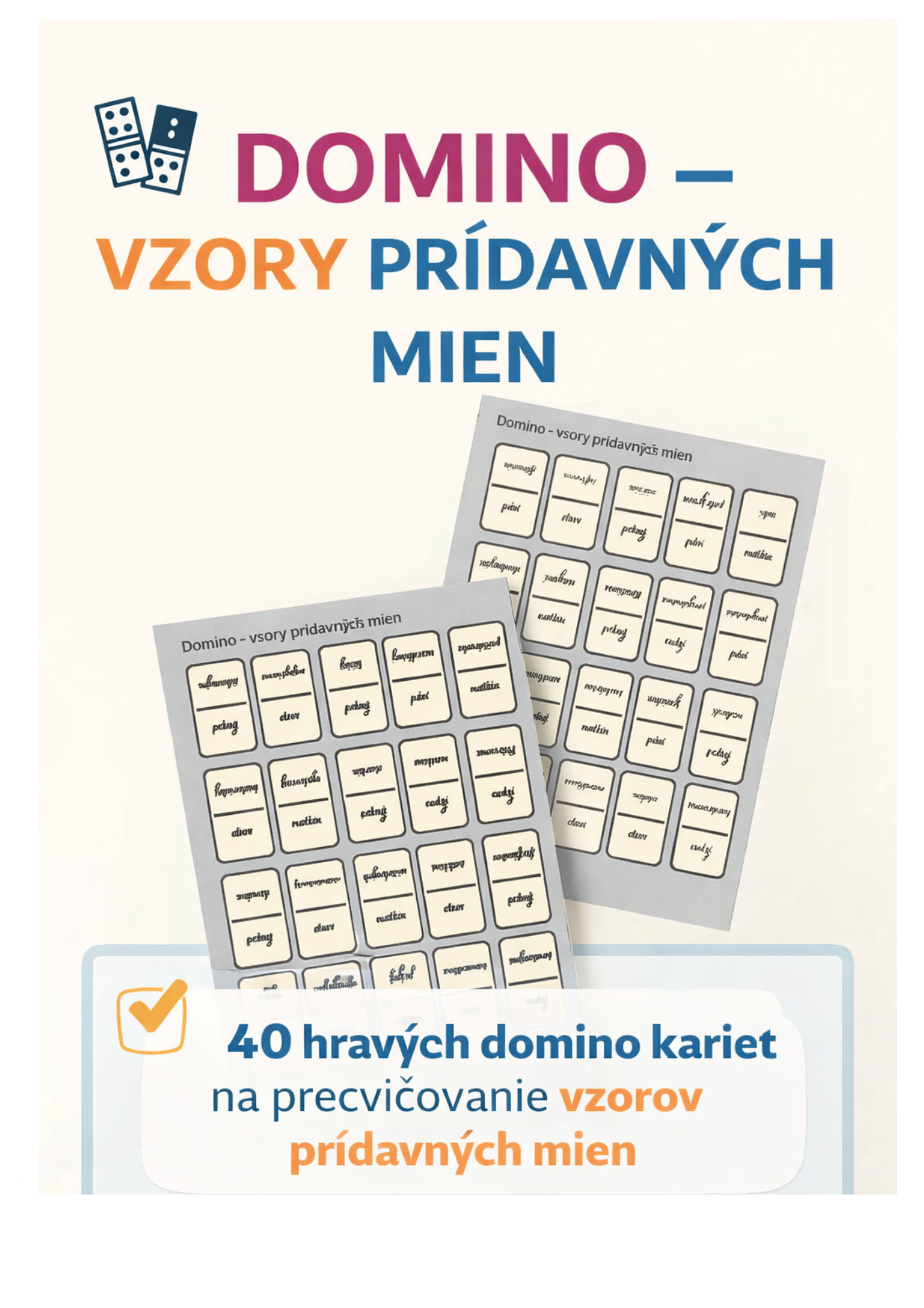 Tento materiál obsahuje spolu 40 domino kartičiek, ktoré slúžia na precvičovanie a upevňovanie vedomostí o vzoroch prídavných mien zábavnou a aktívnou formou. Aktivita je vhodná na individuálnu prácu, prácu vo dvojiciach aj v menších skupinách.