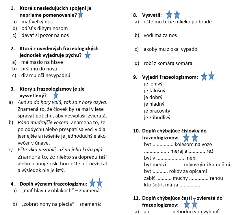 Test je pestrý, jazykovo rôznorodý a obsahuje všetky klasické i modernejšie frazeologické jednotky, ktoré žiaci v 9. ročníku majú poznať.