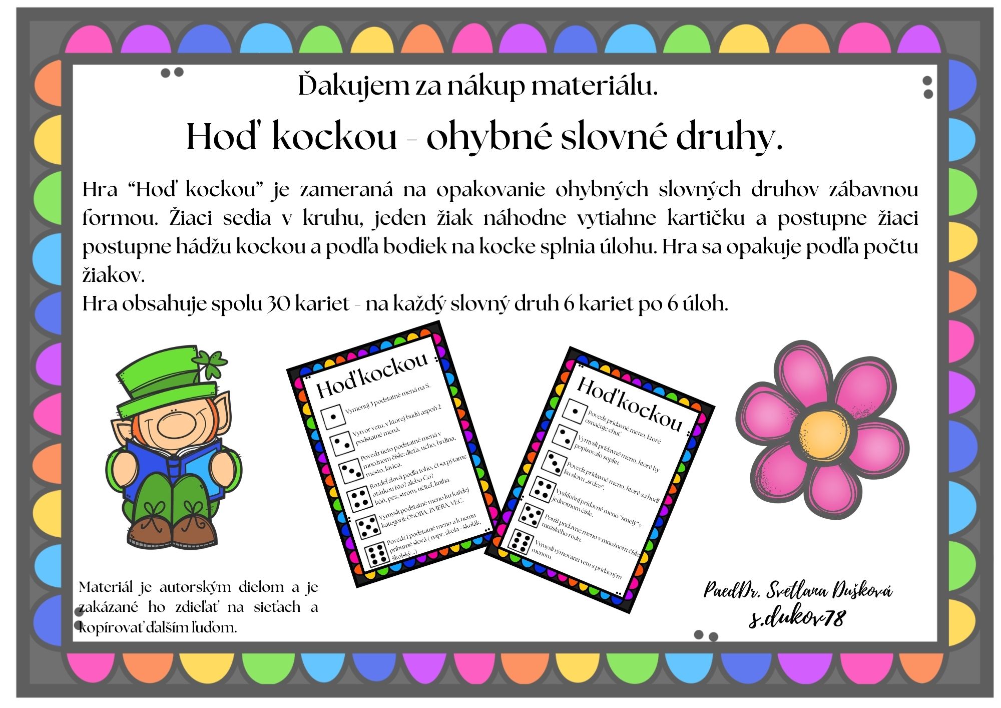 Hra “Hoď kockou” je zameraná na opakovanie ohybných slovných druhov zábavnou formou. Žiaci sedia v kruhu, jeden žiak náhodne vytiahne kartičku a postupne žiaci postupne hádžu kockou a podľa bodiek na kocke splnia úlohu. Hra sa opakuje podľa počtu žiakov.
