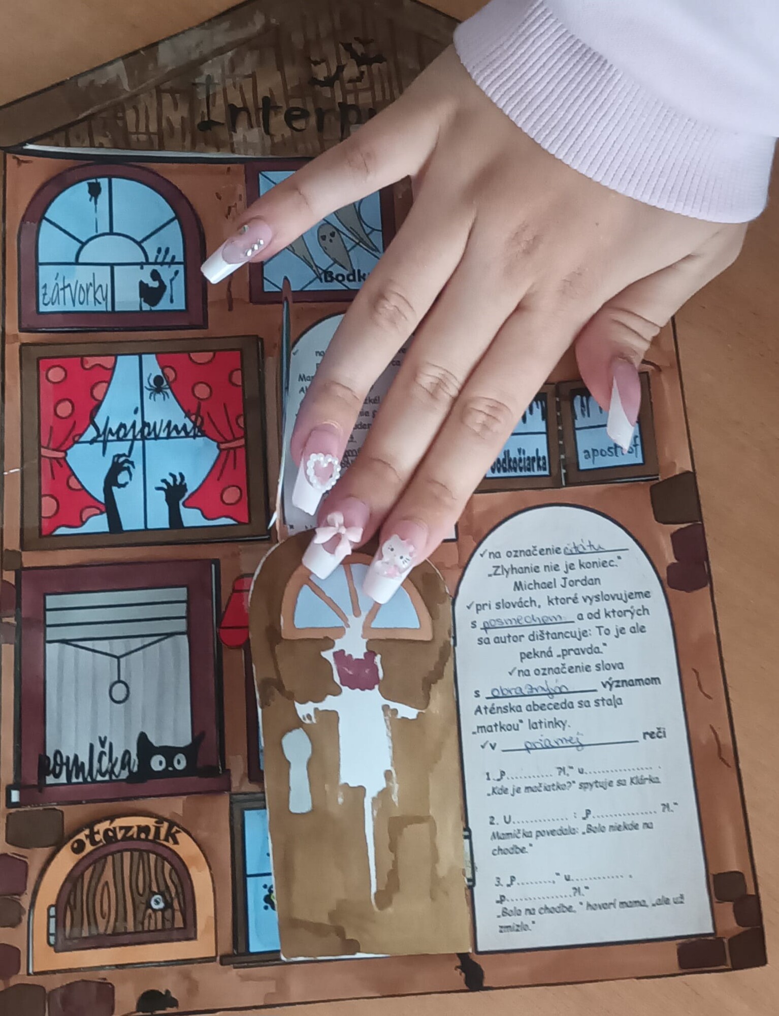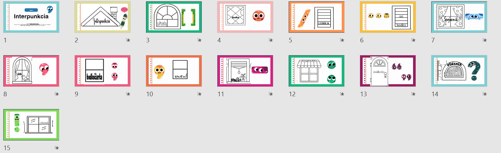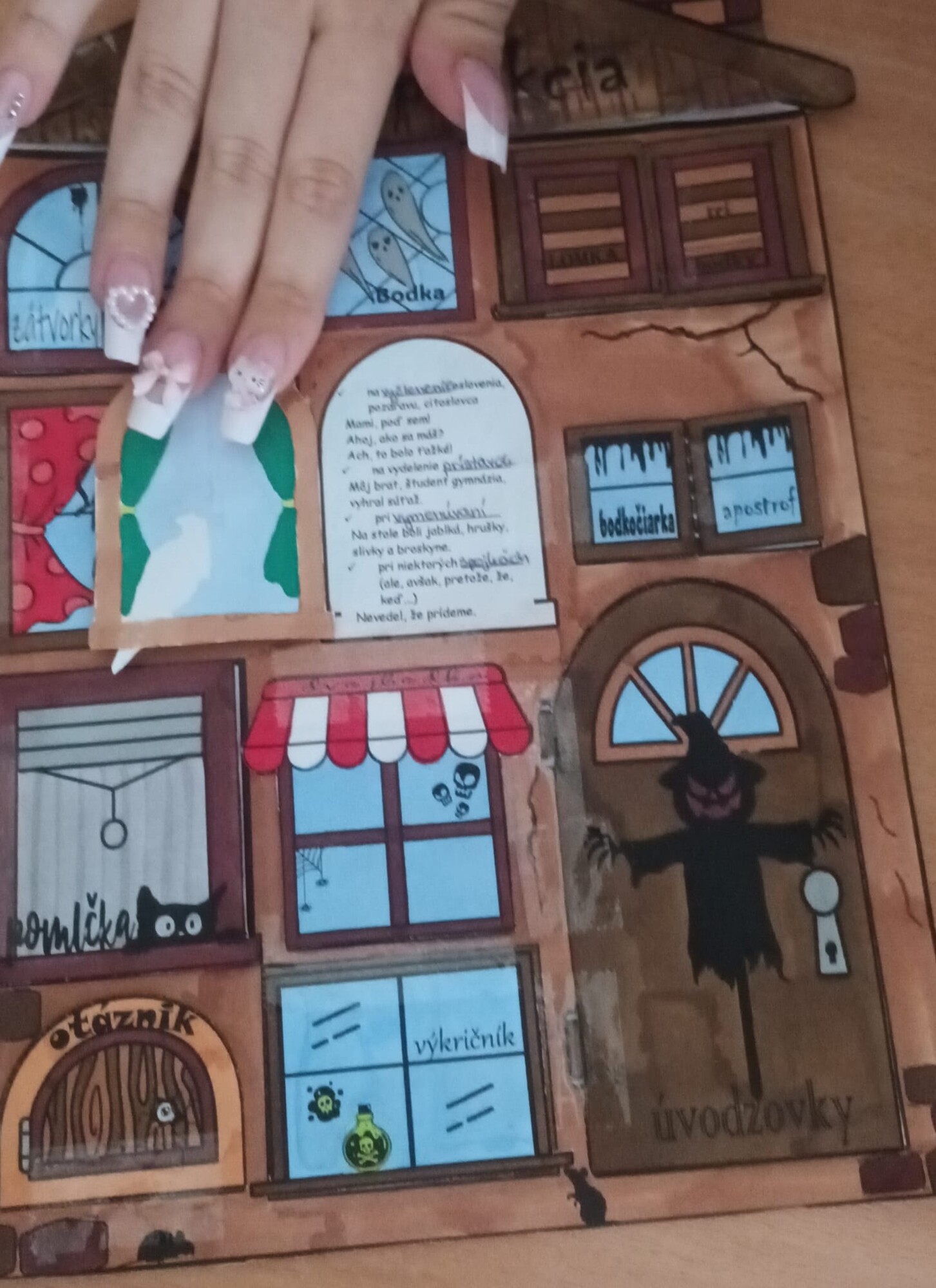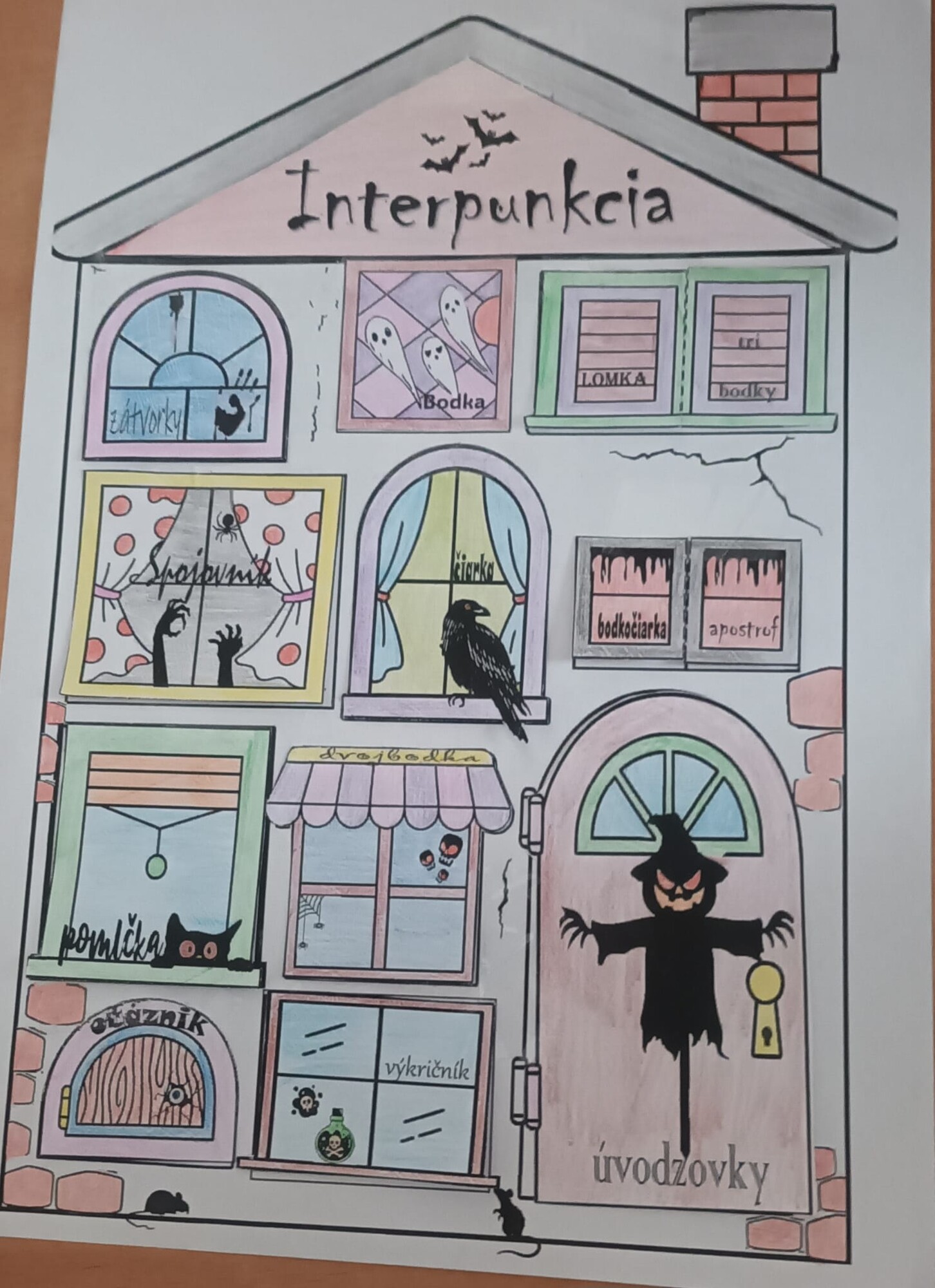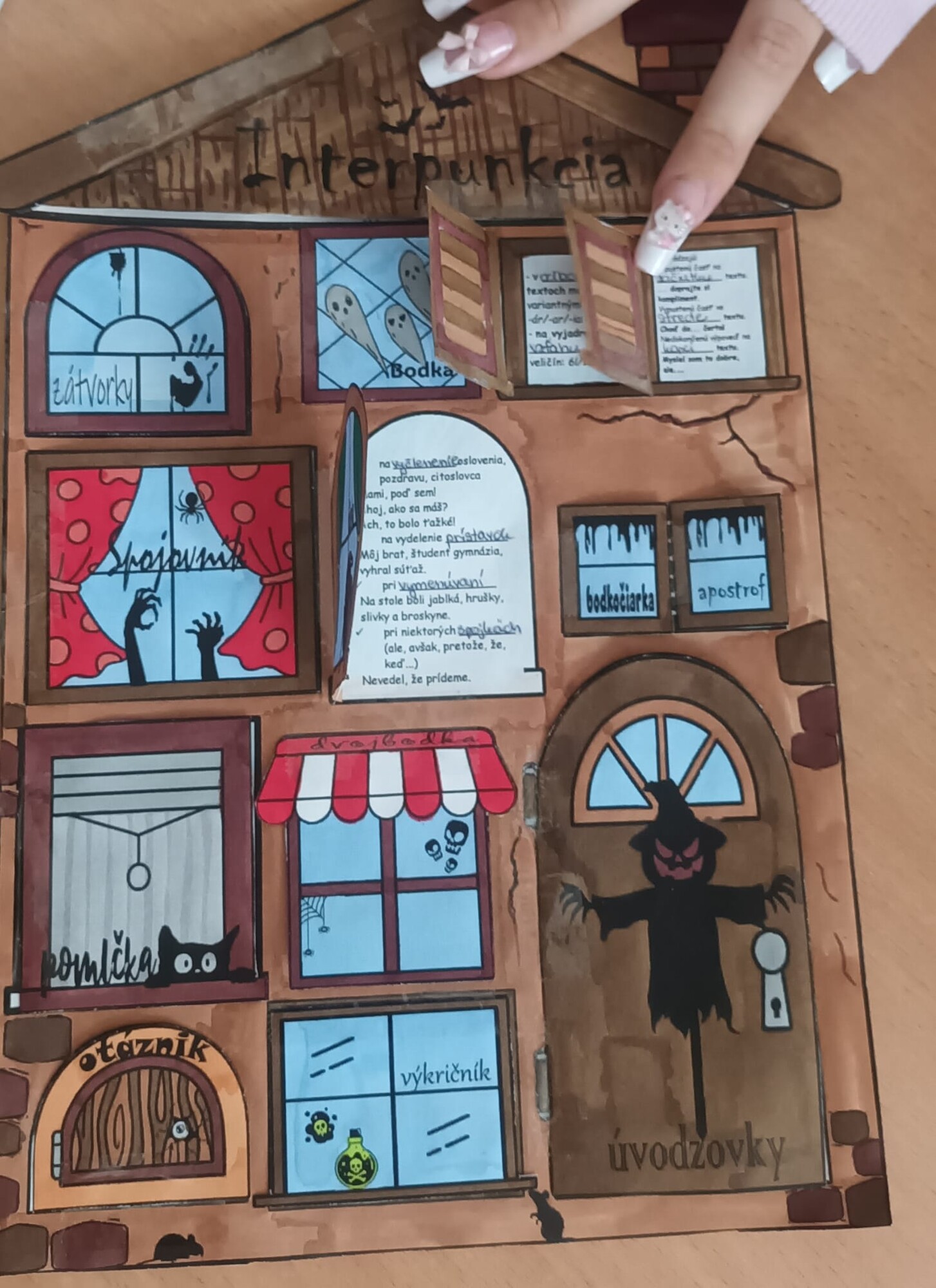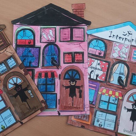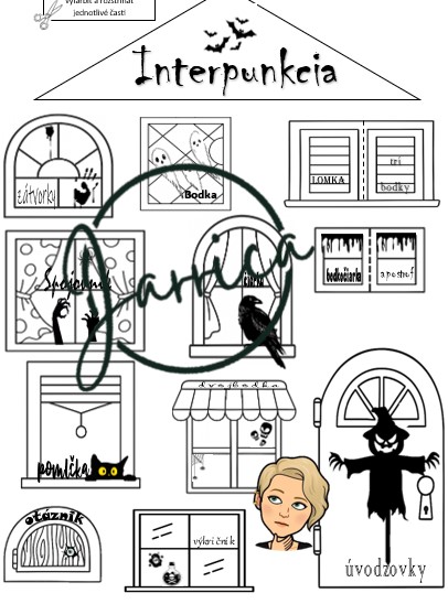 - 4 pre žiakov – 1 pracovný list s textom na doplnenie + 1 list s „oknami“ a názvami interpunkčných znamienok (v klasickej aj halloweenskej verzii).