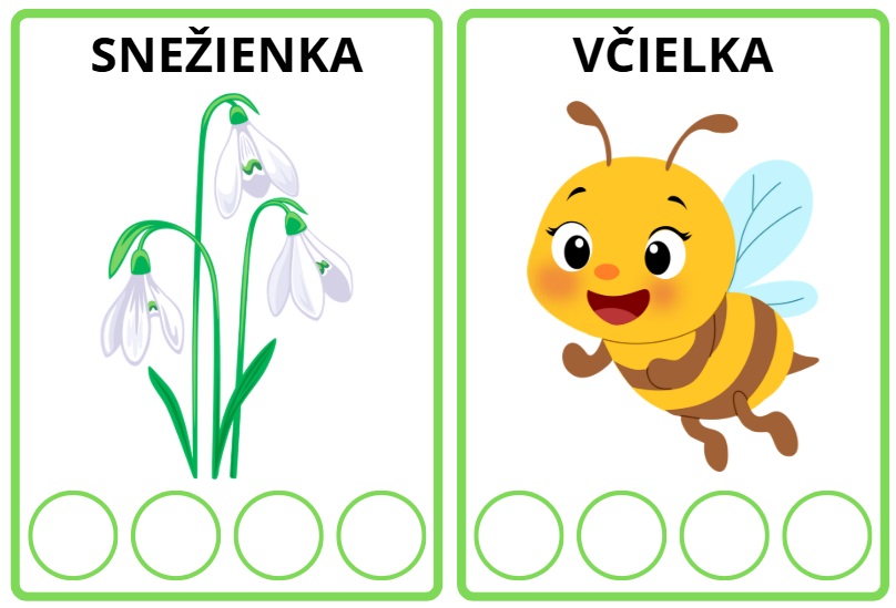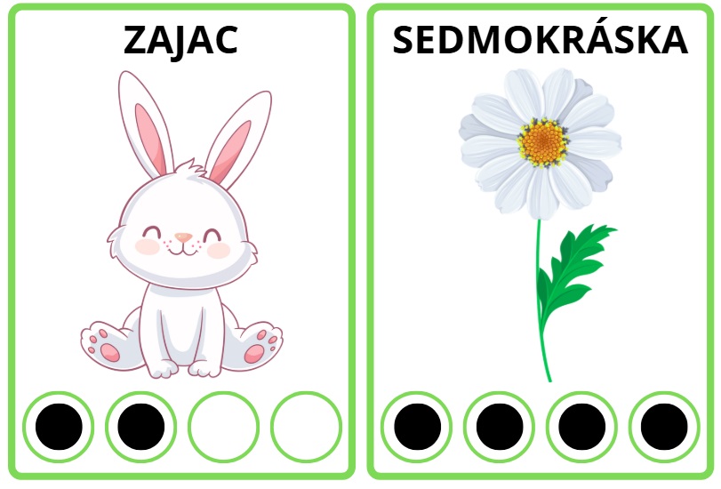 Úlohou dieťaťa je pomenovať predmet na kartičke, vytlieskať slovo a vyznačiť počet slabík vyfarbením krúžkov.