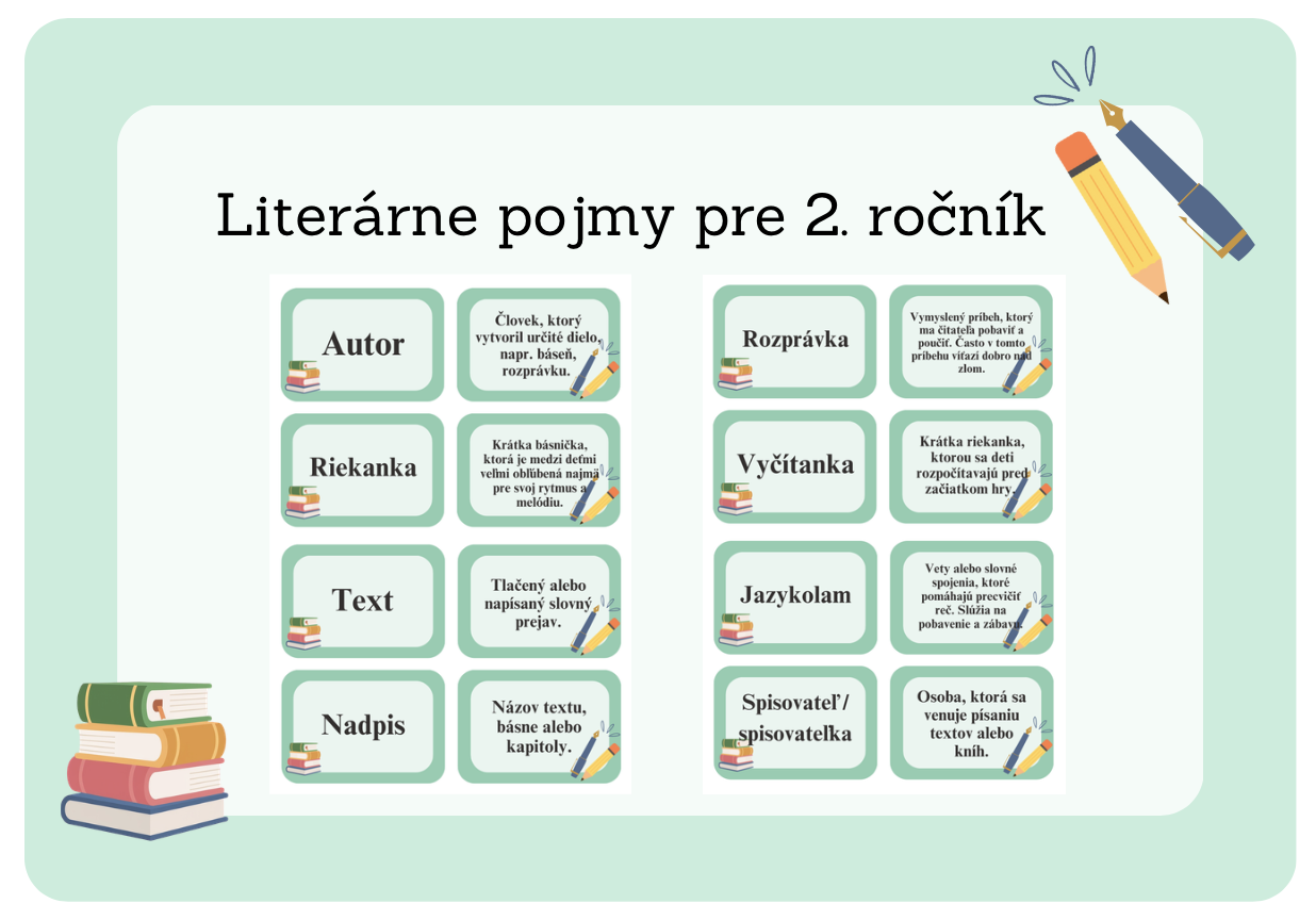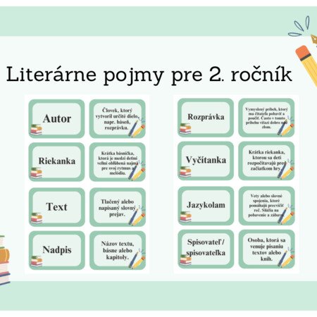 Súbor obsahuje 31 literárnych pojmov pre 2. ročník (autor, riekanka, text, nadpis, verš, báseň, ľudová hra, hádanka, maľované čítanie, ilustrácia, strofa, uspávanka, rozprávka, vyčítanka, jazykolam, spisovateľ, ľudová rozprávka, ilustrátor, hlavná postava, zdrobnenina, čitateľ, knižnica, knihy, bábkové divadlo, bábkoherec, rým, odsek, časopis, noviny, osnova, ľudová pieseň). Na jednej strane sa nachádzajú 4 pojmy.