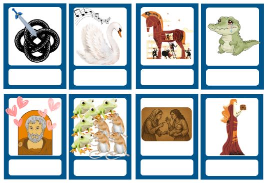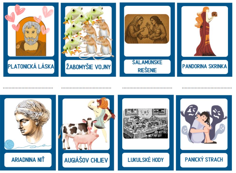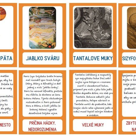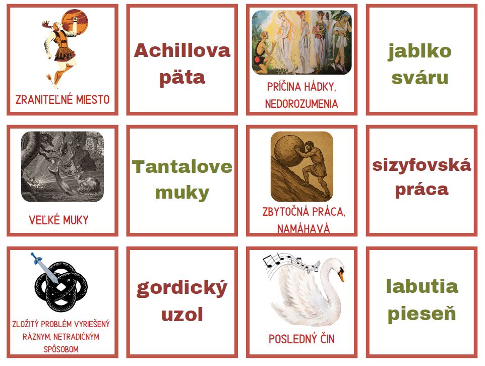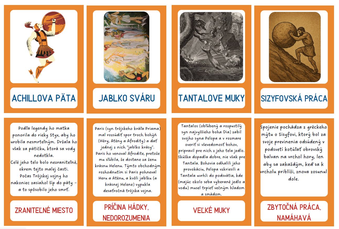 - 4-krát kartičky so 16 okrídlenými výrazmi a vysvetlením ich pôvodu aj s priamym pomenovaním. Žiaci po skupinách vytvárajú dvojice – priraďujú okrídlený význam k jeho pôvodu. Skupiny sú farebne odlíšené, aby sa Vám dvojice nepomiešali, rýchlo ich viete priradiť k správnej skupine a žiadny nebude chýbať, resp. nebude v inej skupine dvojmo. 😊