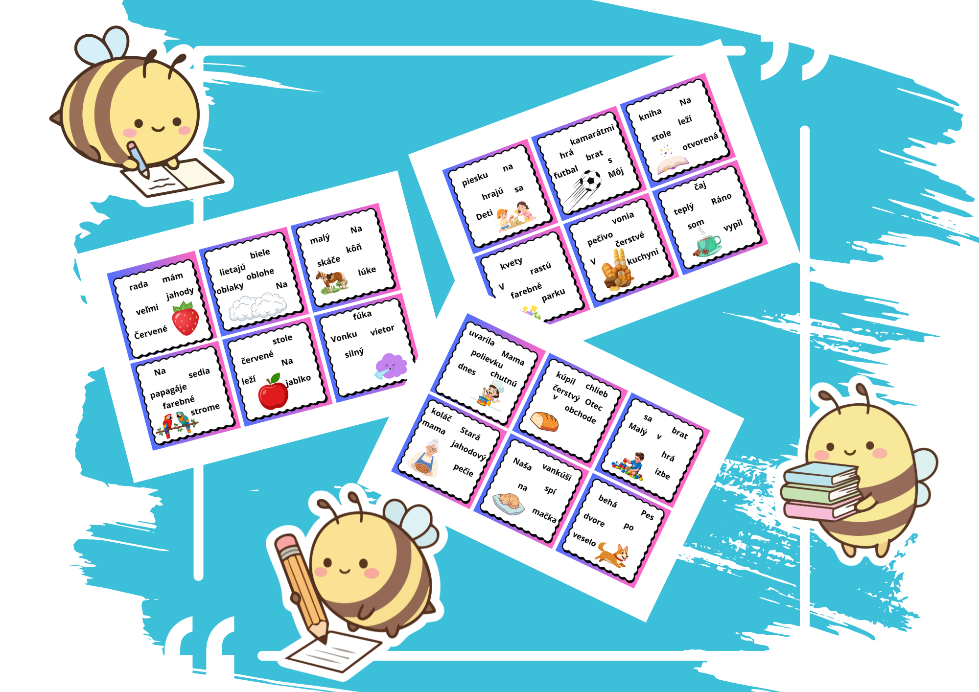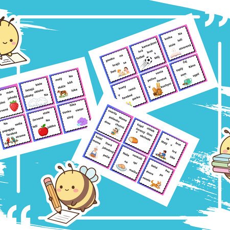 Nachádza sa tam 30 kartičiek s poprehadzovanými vetami. Viete to využiť na čítanie ale aj na prepis viet. Deti musia správne poskladať vety. Viete to aj zalaminovať.