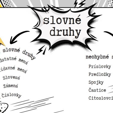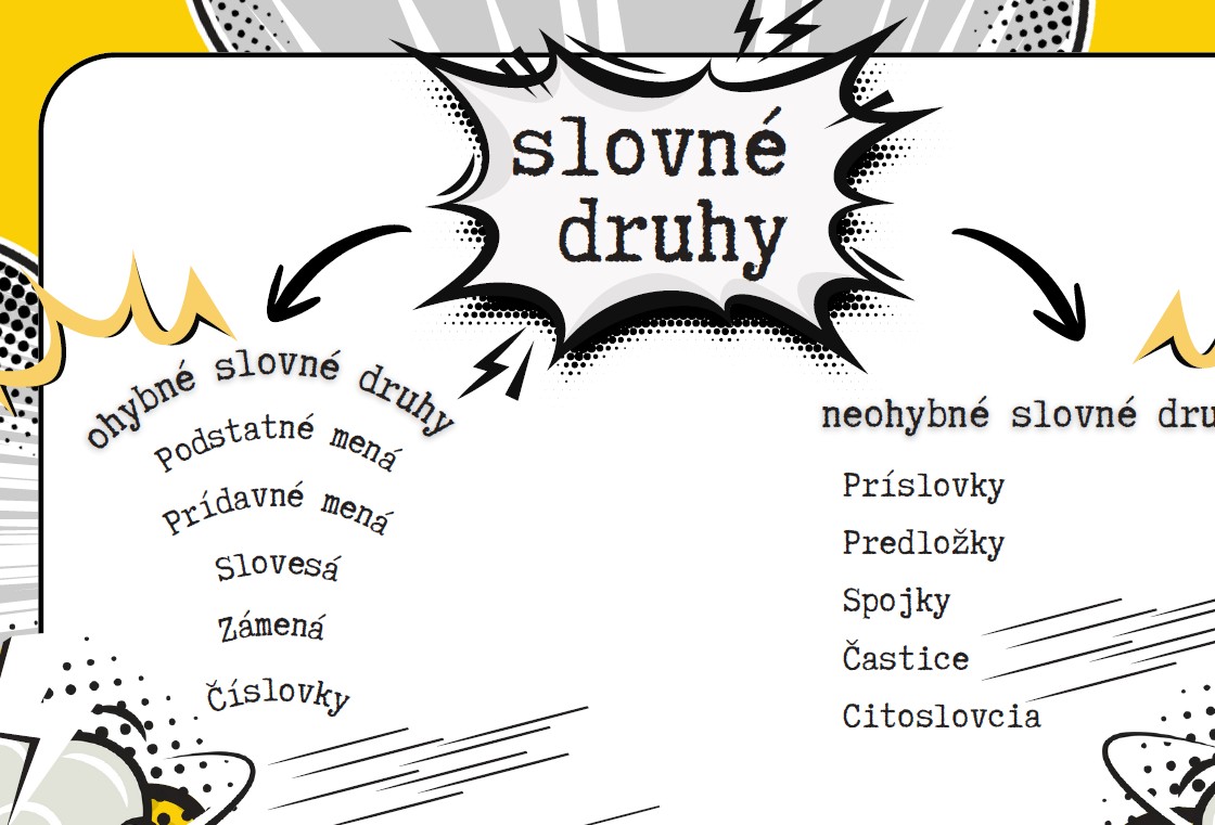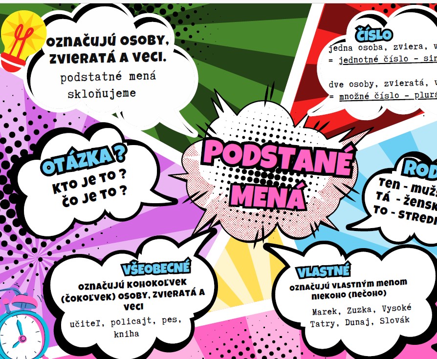 Graficky spracovaný materiál zo slovenského jazyka pre 4. ročník ZŠ, zameraný na slovné druhy a podstatné mená.