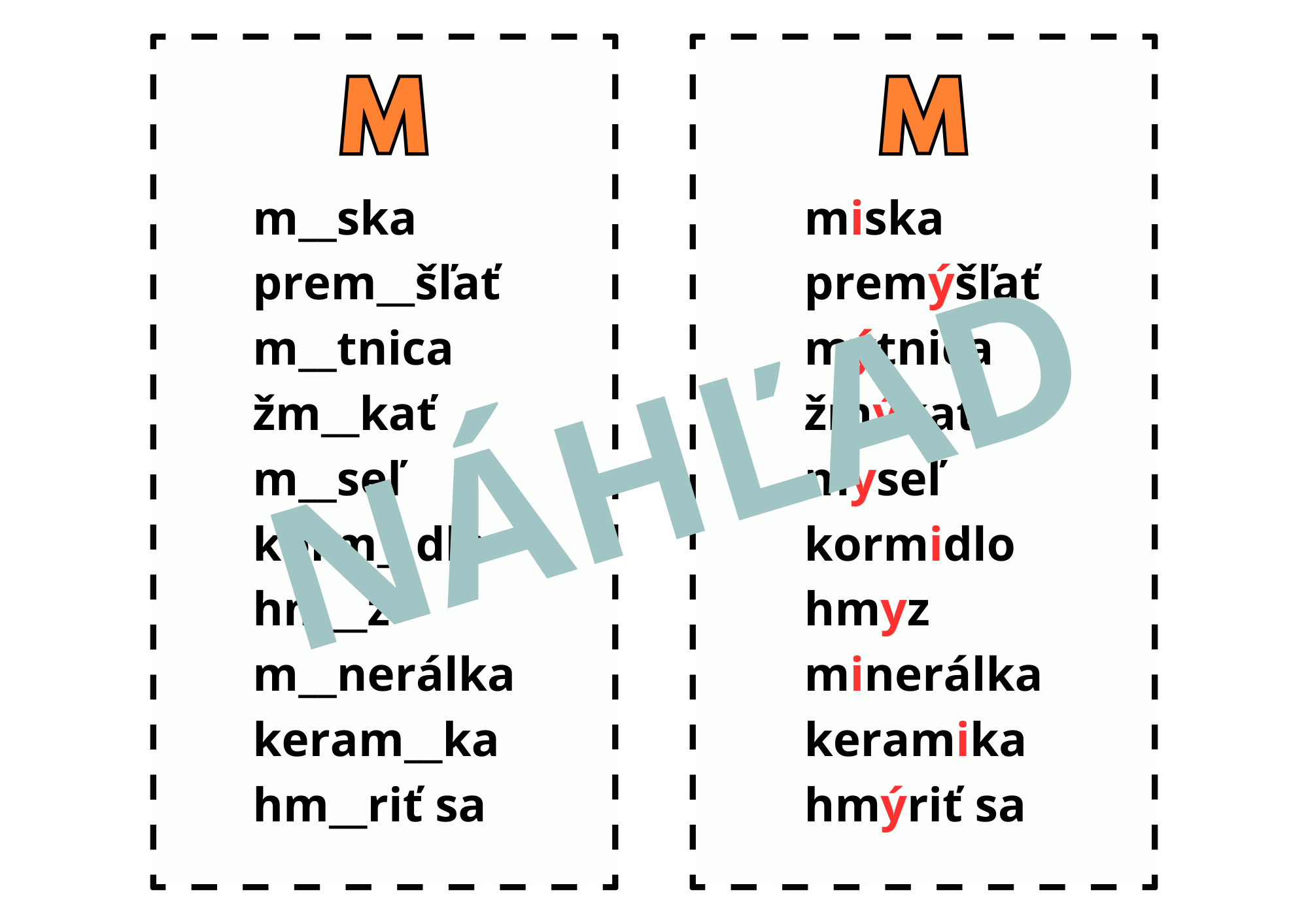 - autokorektívne kartičky na precvičovanie i/y v slovách,
