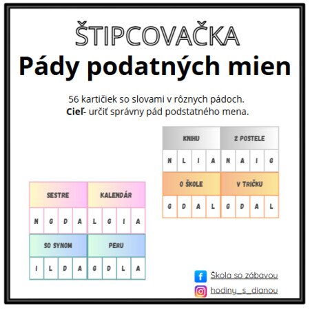 Cieľom súboru je zopakovanie a upevnenie učiva- pády a pádové otázky podstatných mien.