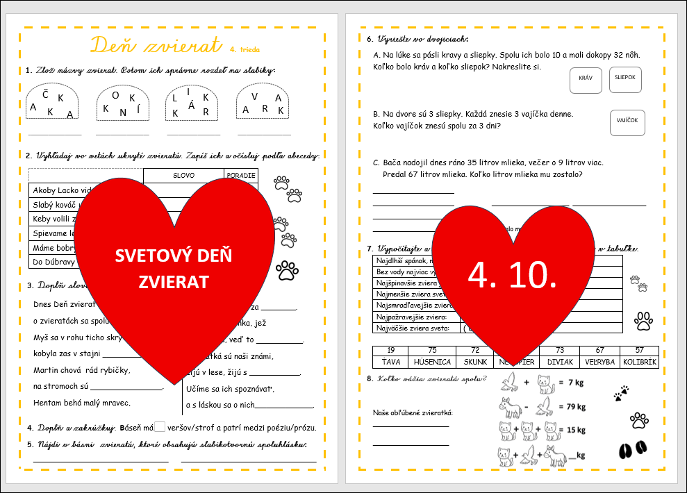 Tento obojstranný pracovný list je navrhnutý pre 4. ročník a prepája slovenský jazyk a matematiku cez tému zvierat, ktorú deti milujú. Aktivita je ideálna na prácu vo dvojiciach alebo skupinách – podporuje spoluprácu, komunikáciu a radosť z objavovania.