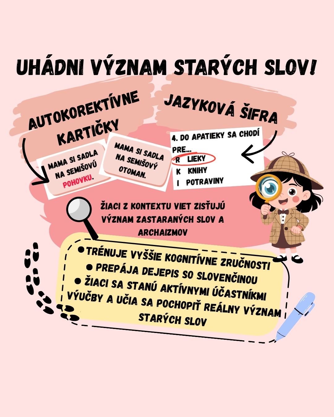 Žiaci sa stanú jazykovými detektívmi 🕵️♀️. Z kontextu vety hádajú význam zastaraného slova či archaizmu a hneď si môžu overiť, či mali pravdu – správna odpoveď sa nachádza na druhej strane kartičky. Stačí ich len vytlačiť a nastrihať.