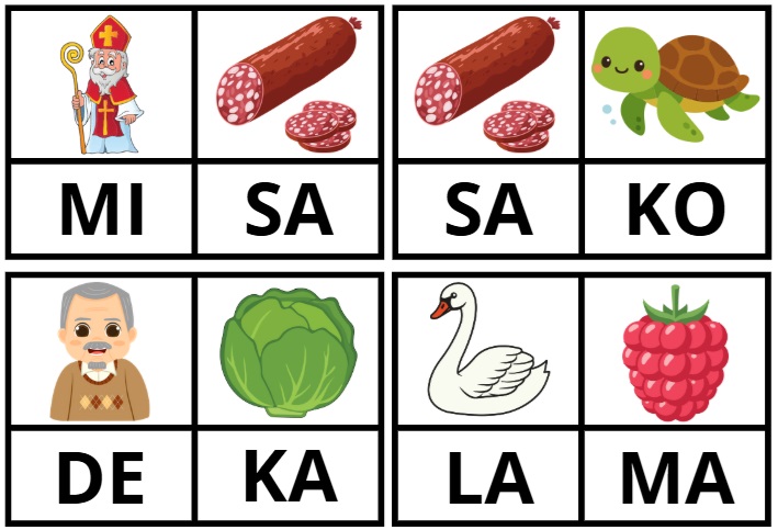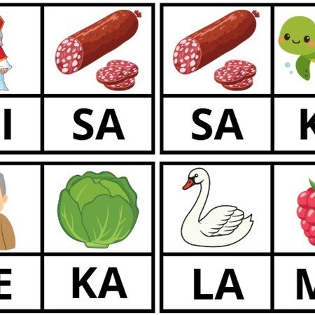 Úlohou dieťaťa je zistiť, aké slovo sa ukrýva na kartičke s obrázkami a to tak, že napíše do prázdnych rámčekov začiatočné slabiky obrázkov.