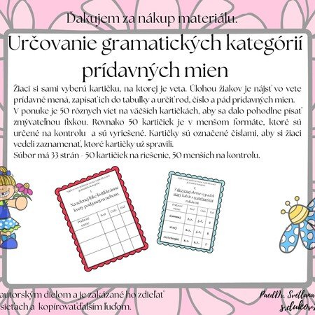 Žiaci si sami vyberú kartičku, na ktorej je veta. Úlohou žiakov je nájsť vo vete prídavné mená, zapísať ich do tabuľky a určiť rod, číslo a pád prídavných mien.