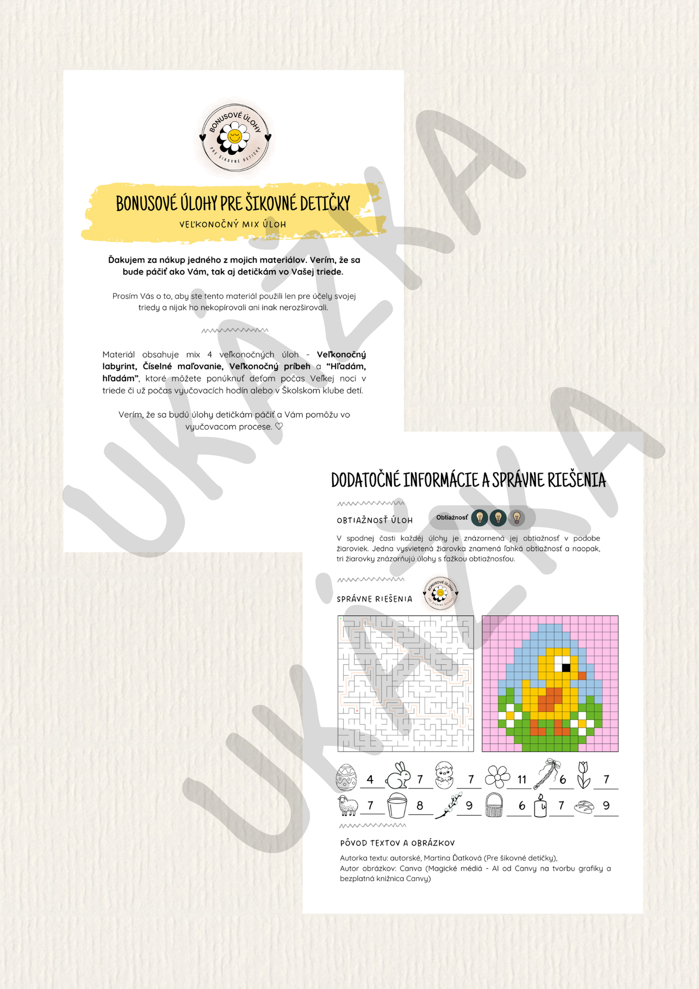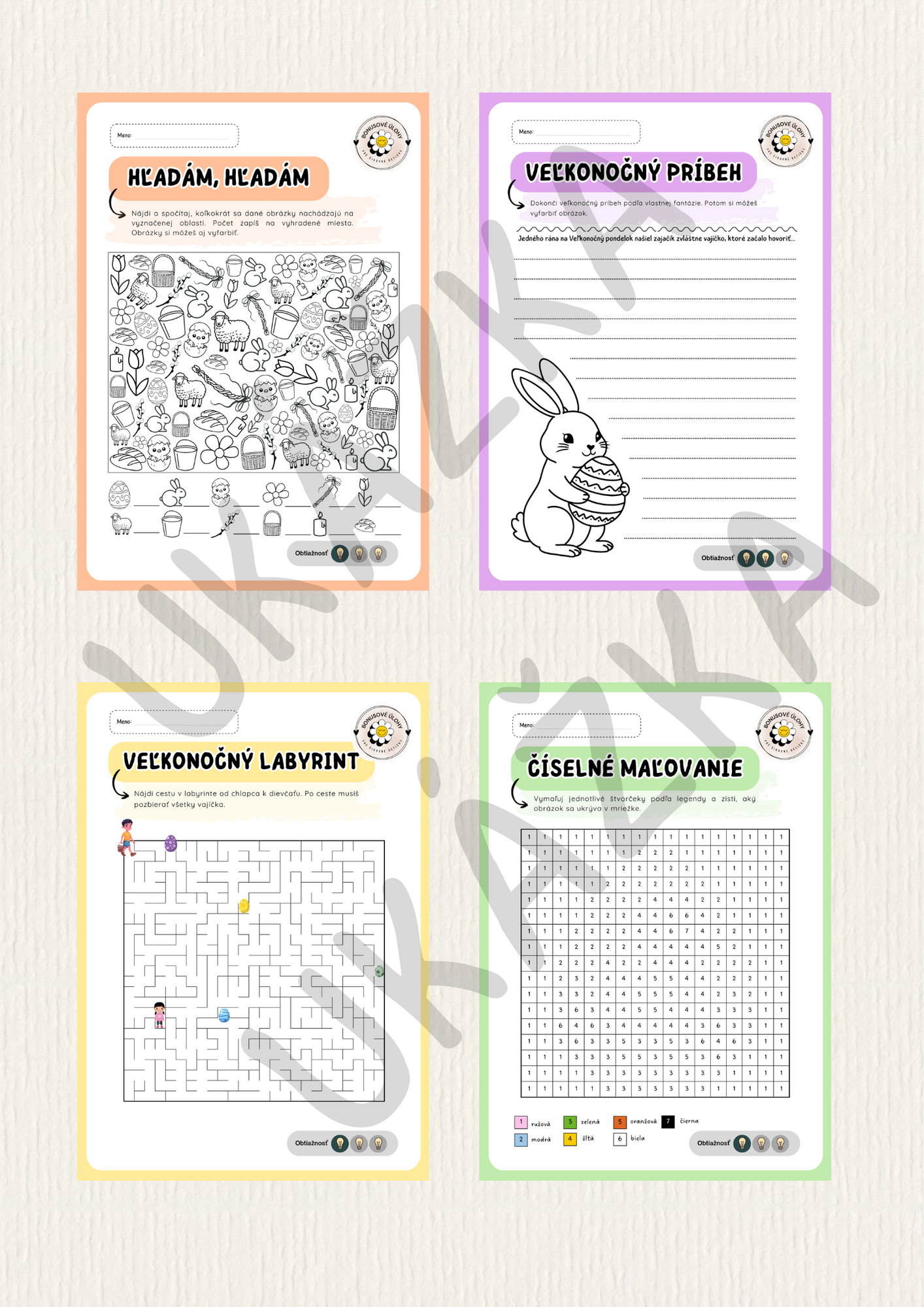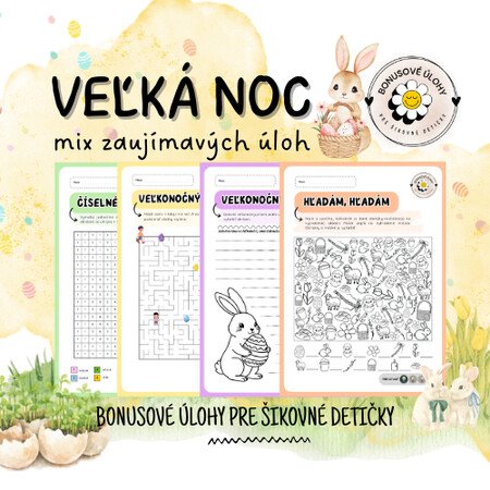 Súbor obsahuje 4 rôzne veľkonočné úlohy 🐣, ktoré sú vhodné na využitie počas predveľkonočného obdobiau Vás v triede. Je ich možné využiť aj ako doplnkovú či bonusovú úlohu pre detičky, ktoré už skončili s Vami zadanou prácou. Sú vhodné pre rozvoj fantázie i tréning pozornosti.