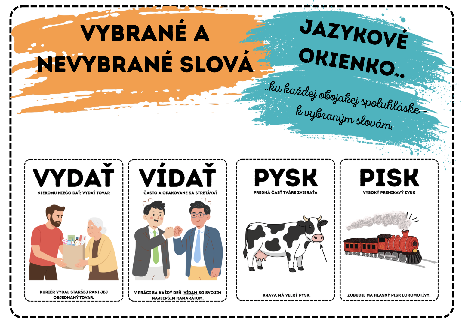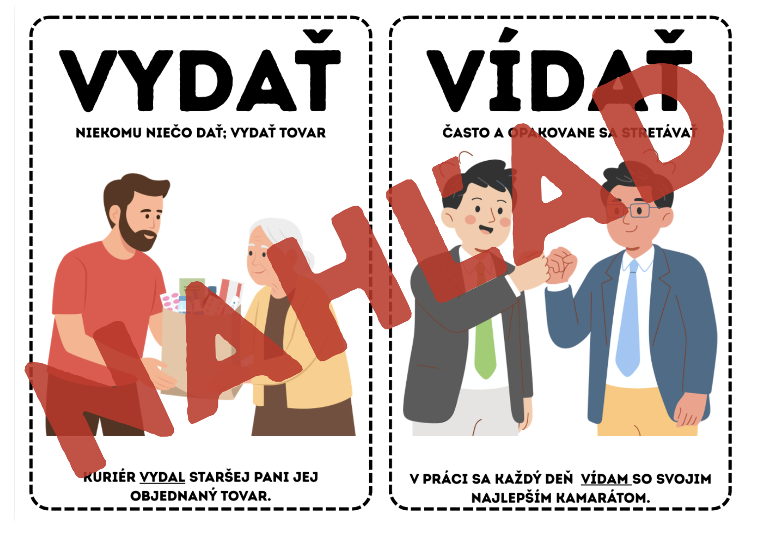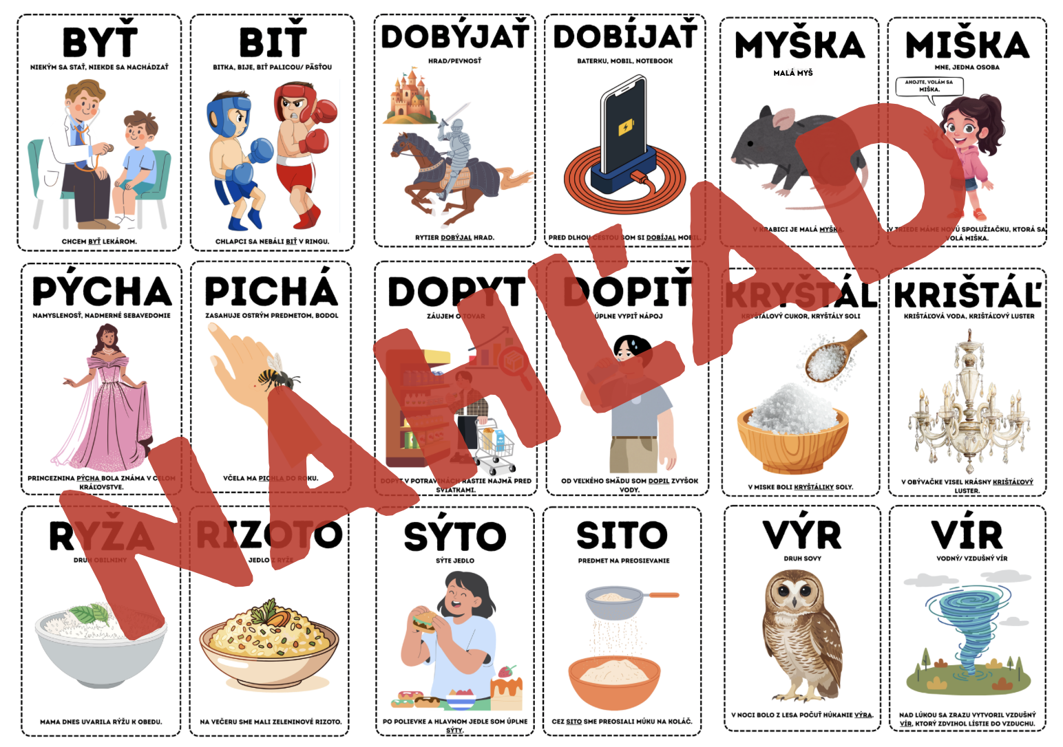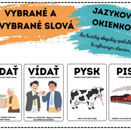 -slová sú doplnené o obrázok, vysvetlenie ich významu a vetu, ktoré žiakom pomáhajú lepšie si zapamätať rozdiely medzi nimi