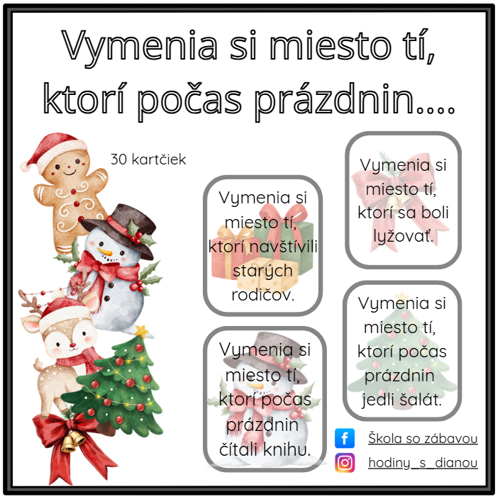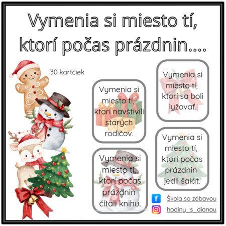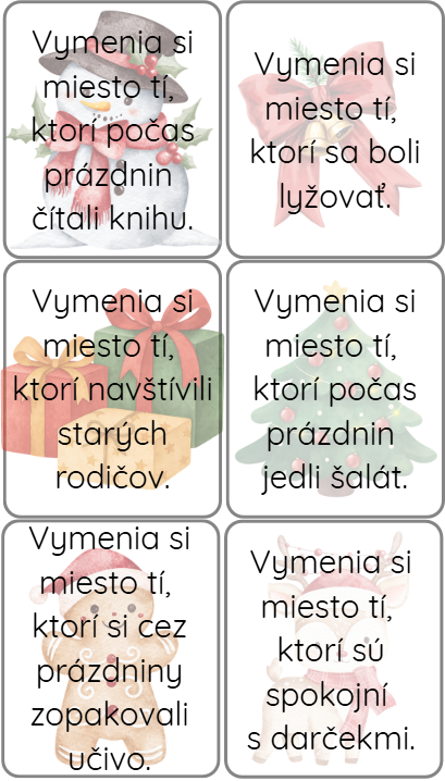 Napr: Vymení sa ten, kto sa cez prázdniny lyžoval. Postavia sa všetci žiaci, ktorí počas prázdnin lyžovali a ich úlohou je, aby si čo najskôr uchmatli ľubovoľnú stoličku. Žiak si nesmie sadnúť na to isté miesto. Pokiaľ mu už miesto neostalo, zoberie si kartičku, prečíta ju a opäť si žiaci vymenia miesto podľa pokynov na kartičke.