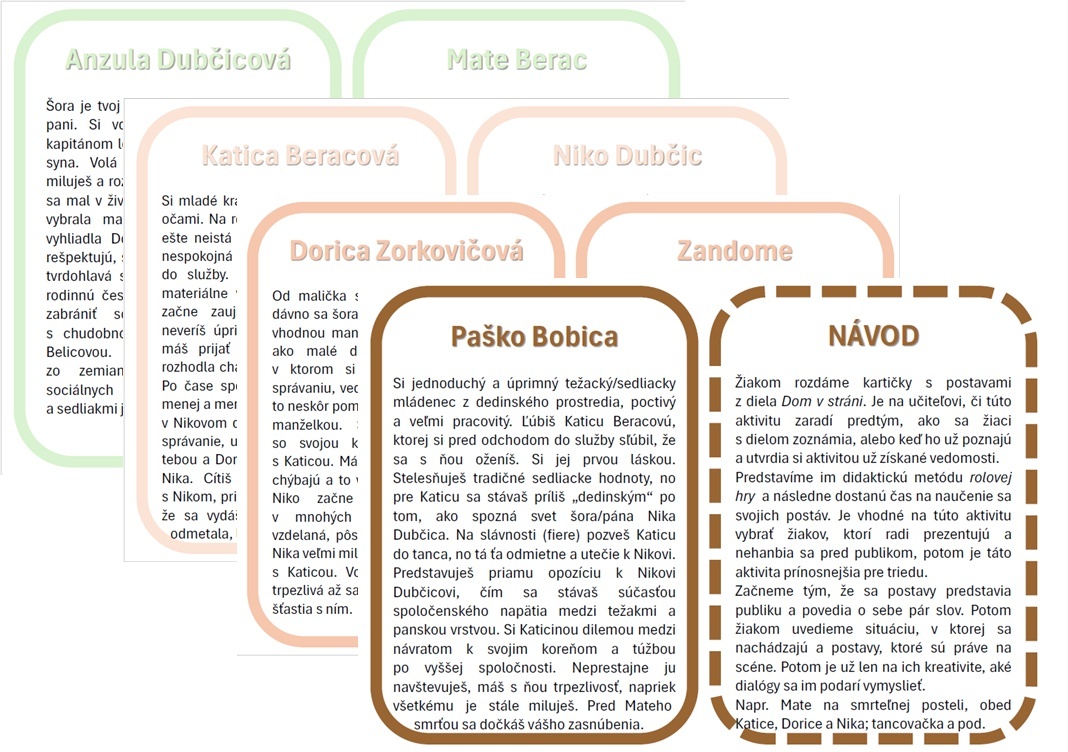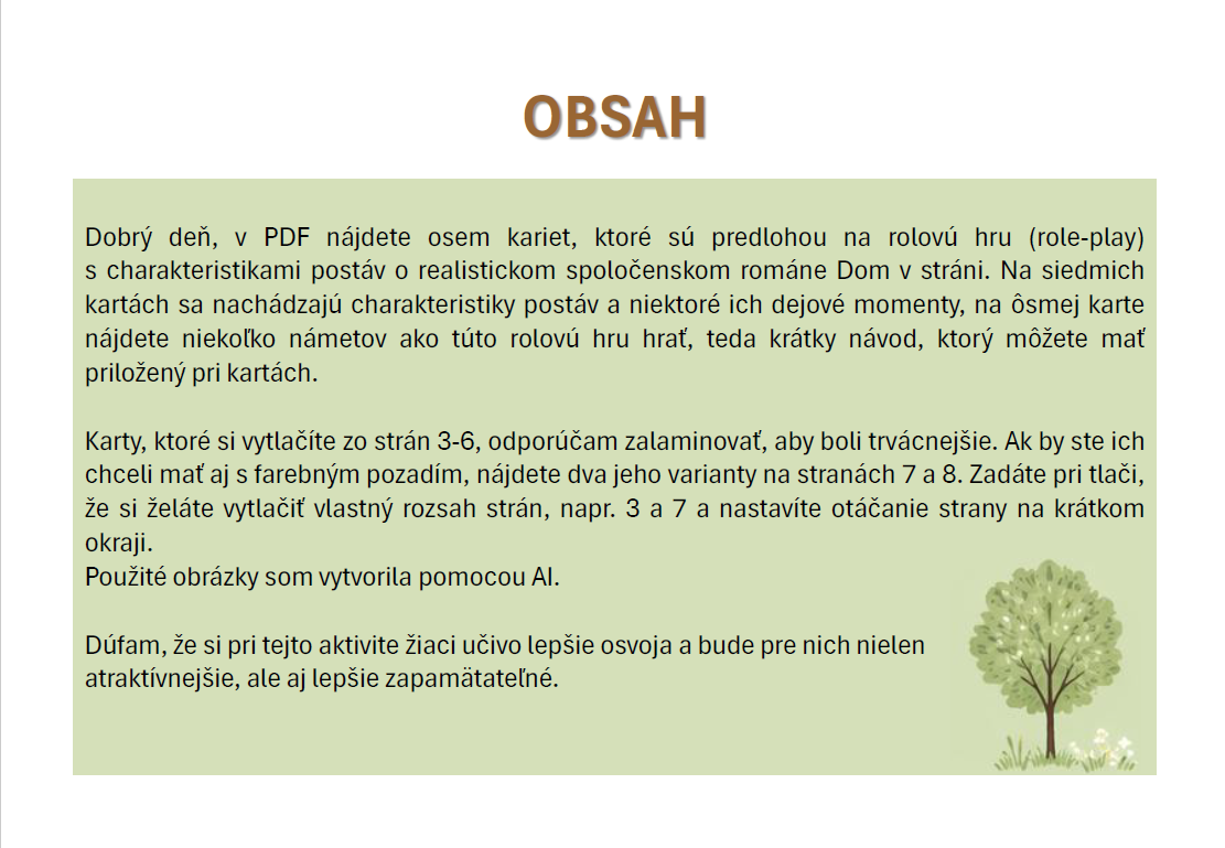 Dobrý deň, v PDF nájdete osem kariet, ktoré sú predlohou na rolovú hru (role-play) s charakteristikami postáv o realistickom spoločenskom románe Dom v stráni.