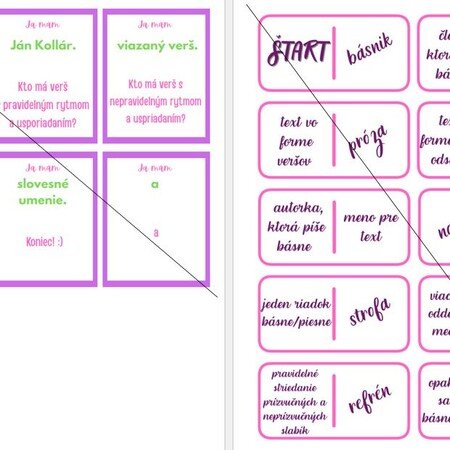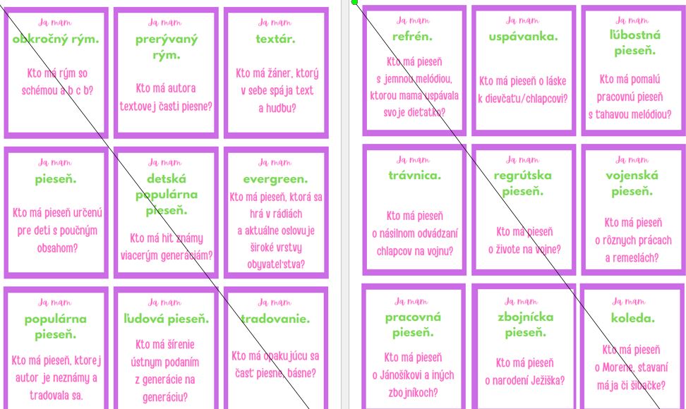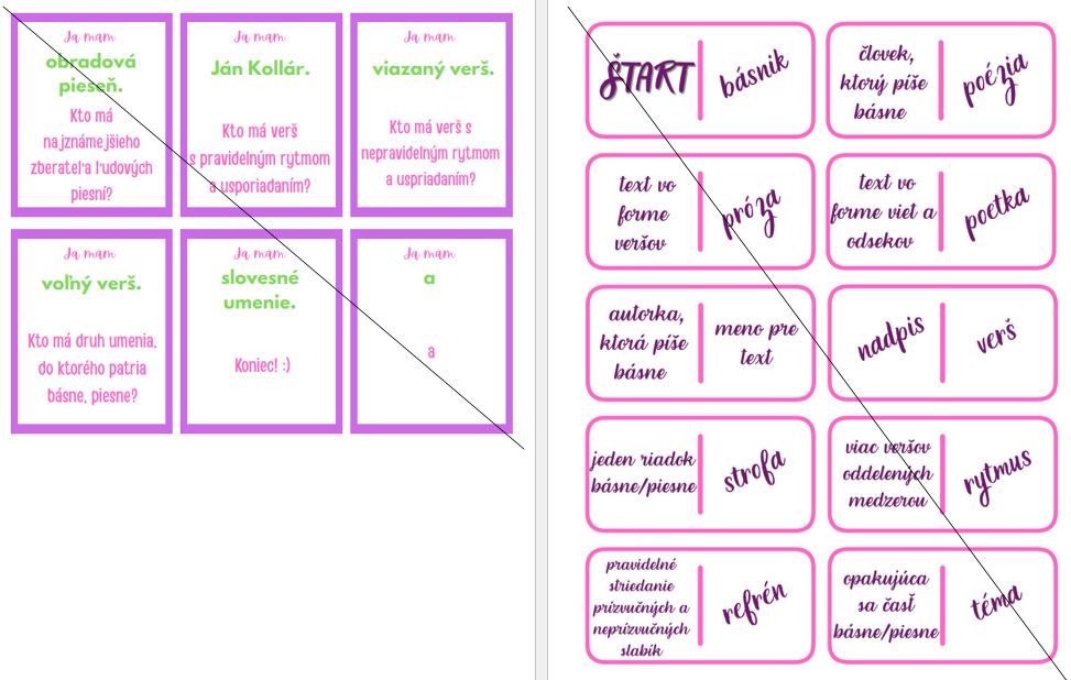 Na kartičkách sú formou hry Ja mám, kto má vytvorené otázky k téme poézia. Ide o opakovanie pojmov súvisiacich s básňou, piesňou podľa štátneho vzdelávacieho programu, no trošku aj navyše.