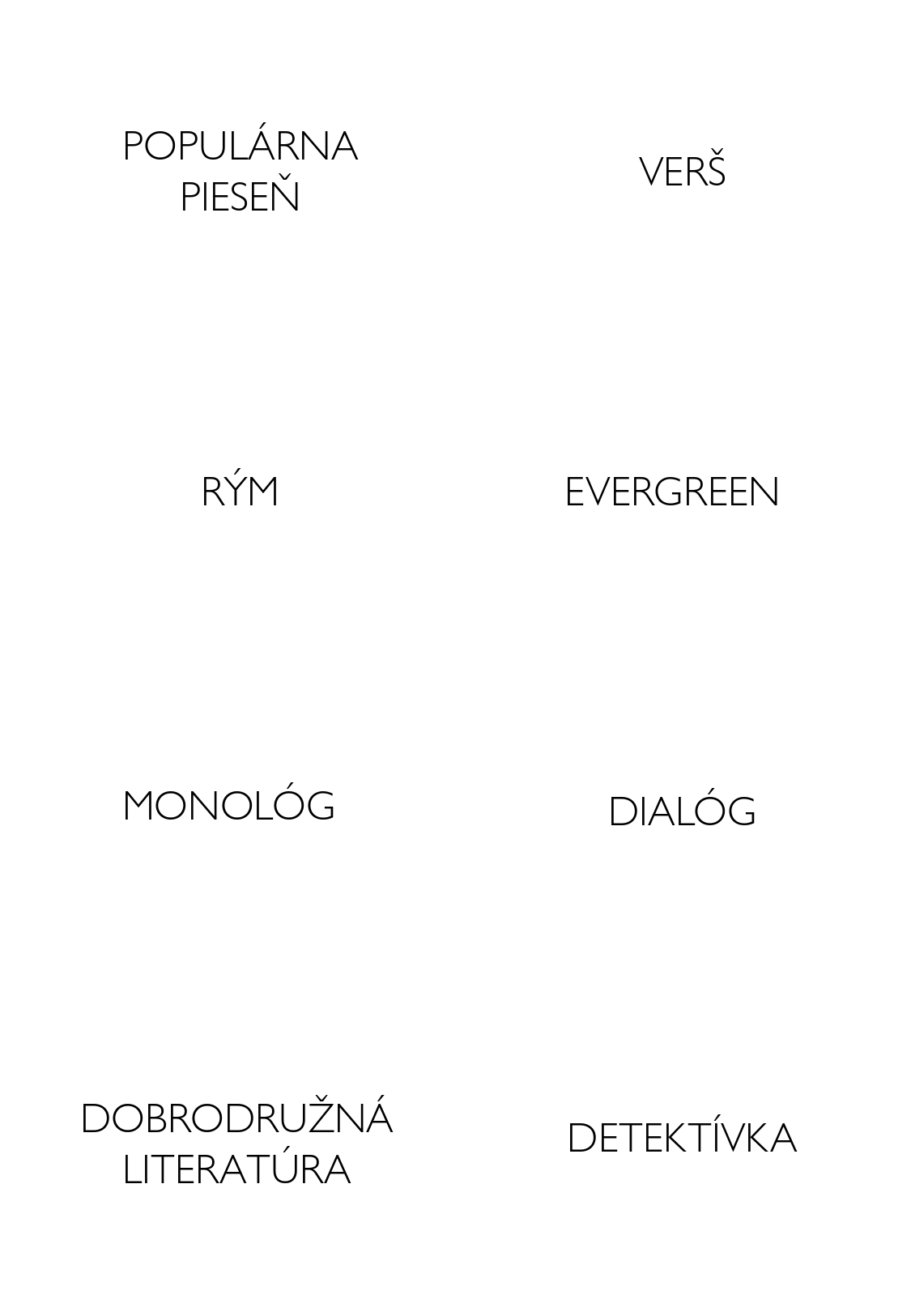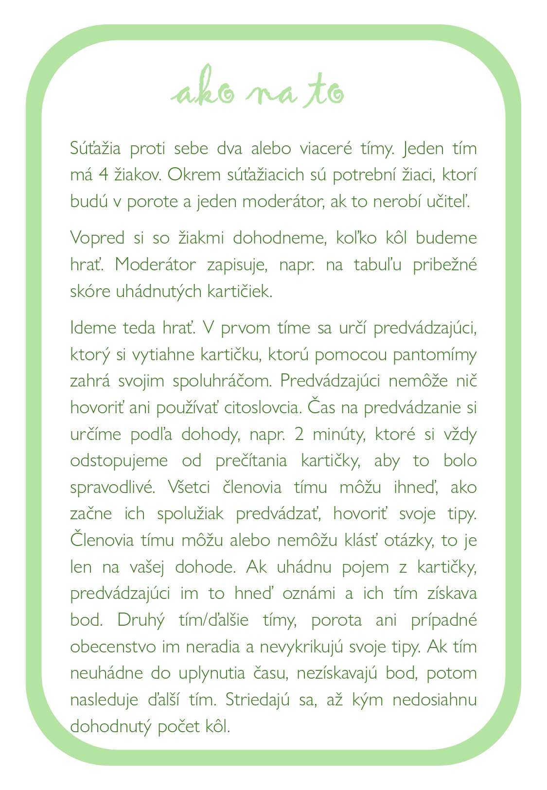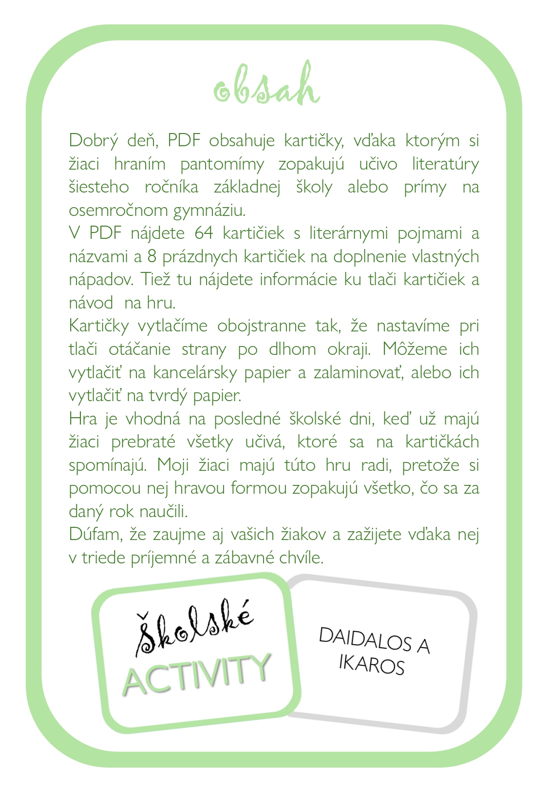 Dobrý deň, PDF obsahuje kartičky, vďaka ktorým si žiaci hraním pantomímy zopakujú učivo literatúry šiesteho ročníka základnej školy alebo prímy na osemročných gmynáziách. V PDF nájdete 64 kartičiek s literárnymi pojmami a 8 prázdnych kartičiek na doplnenie vlastných nápadov. Tiež tu nájdete informácie ku tlači kartičiek a návod na hru.