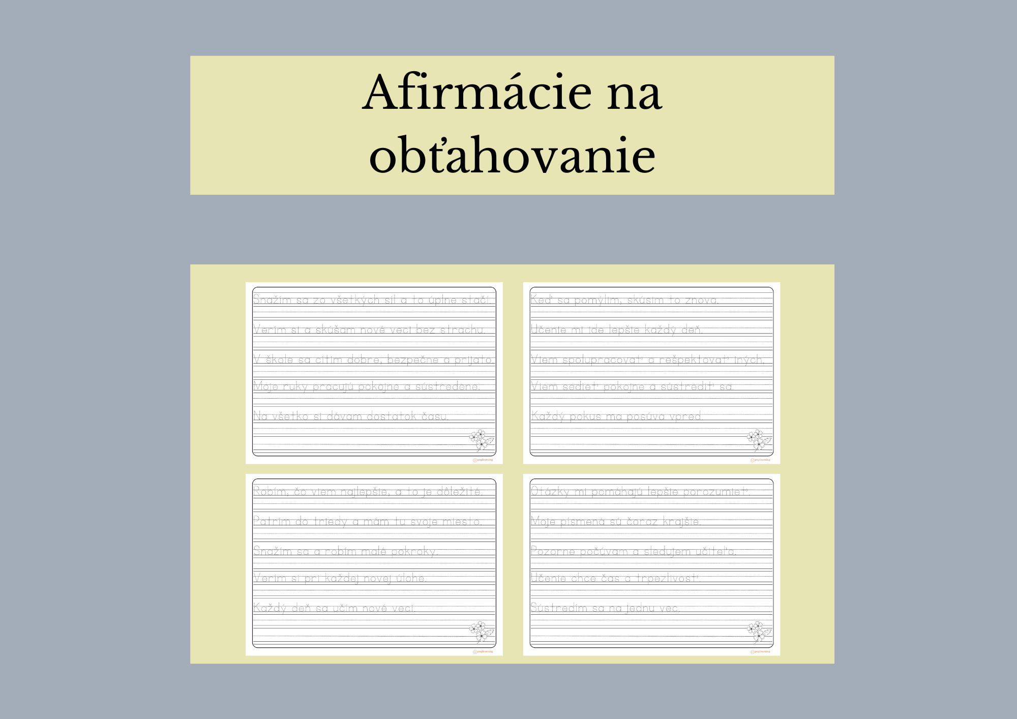 - Tento materiál obsahuje 20 afirmácií. Slúži na precvičovanie písania a na posilňovanie pozitívneho myslenia u žiakov 1. stupňa.