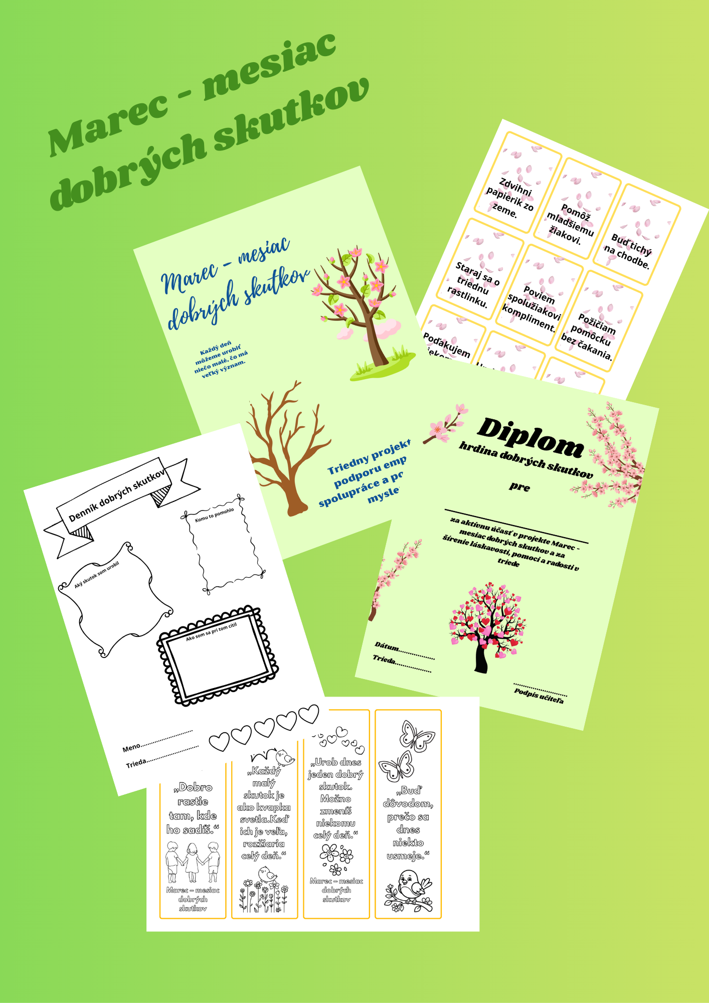 Súbor obsahuje 13 strán na ktorých sa nachádza aktivita Marec - mesiac dobrých skutkov. Nachádza sa tam reflexné koleso, denník dobrých skutkov, kartičky s dobrými skutkami, aktivita na celý mesiac resp. týždeň, diplom za účasť, diplom za najláskavejšieho žiaka a záložky do knihy na vymaľovanie.