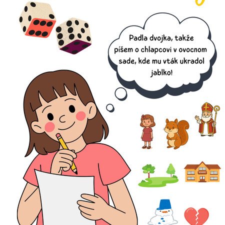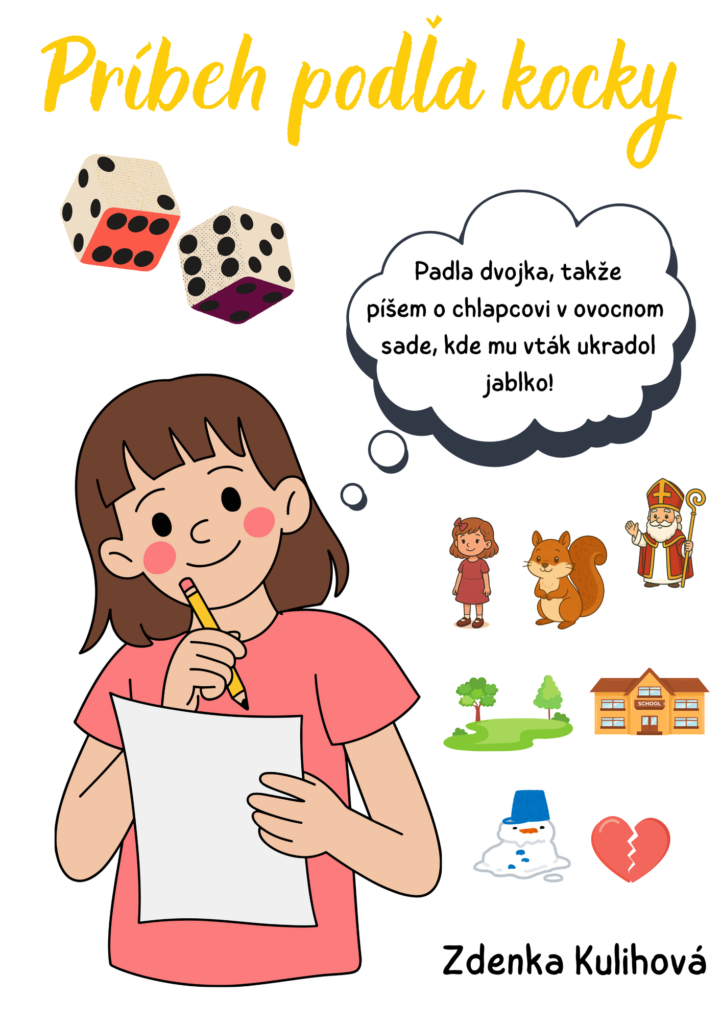 Listy slúžia na premietnutie na tabuľku, prípadne ich môžete vytlačiť, zalaminovať a umiestniť na žiakom dostupné miesto. Cieľom tejto didaktickej hry je hodiť kockou a písať krátky príbeh na tému, ktorú nám ukázalo číslo na kocke. Môžu byť použité dve varianty. Buď hodím jedenkrát a píšem podľa riadku alebo hádžem trikrát a prvé číslo mi určí postavu, druhé číslo mi určí miesto a tretie číslo mi určí problém. Slúži na motiváciu žiakov k písaniu a rozvíjaniu kreativity.