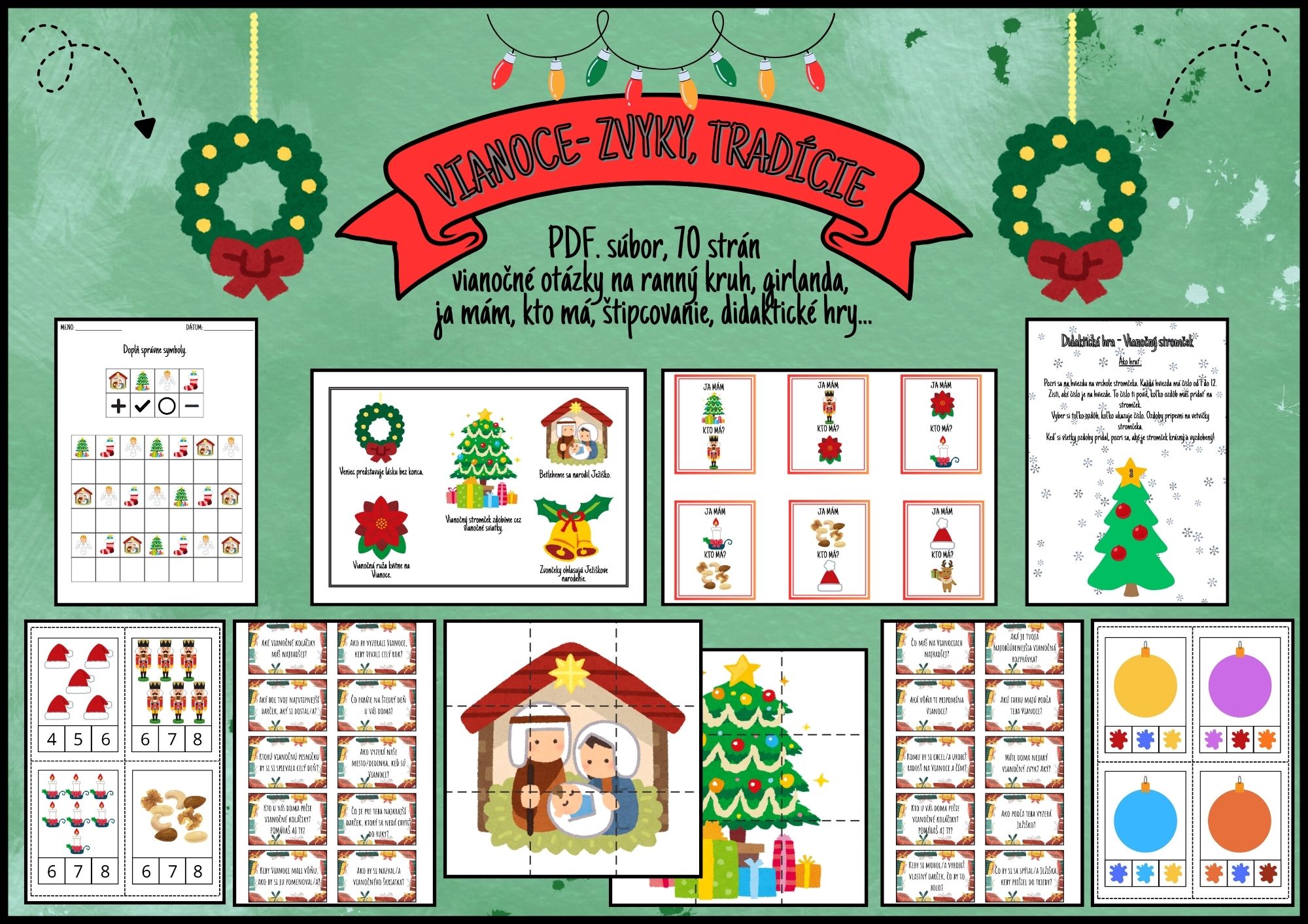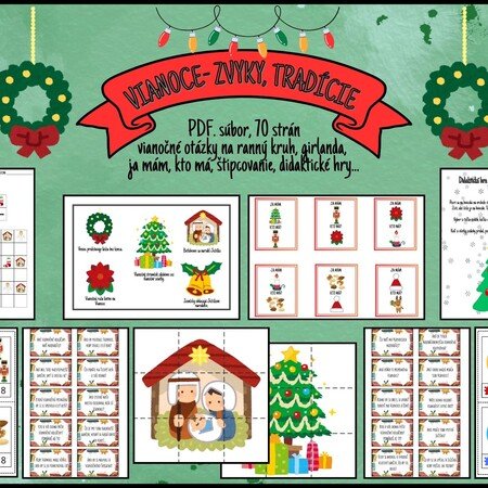 Milé pani učitel'ky, vychovávateľky, rodičia. Pripravila som si pre vás 70 strán pracovných listov na tému „Vianoce - zvyky a tradície.” V tomto PDF. súbore nájdete:
