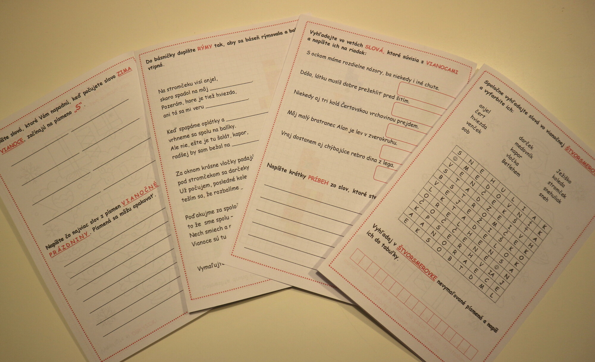 - Vianočná osemsmerovka – hľadanie slov, vyfarbovanie a tajné posolstvo z nevyfarbených písmen.