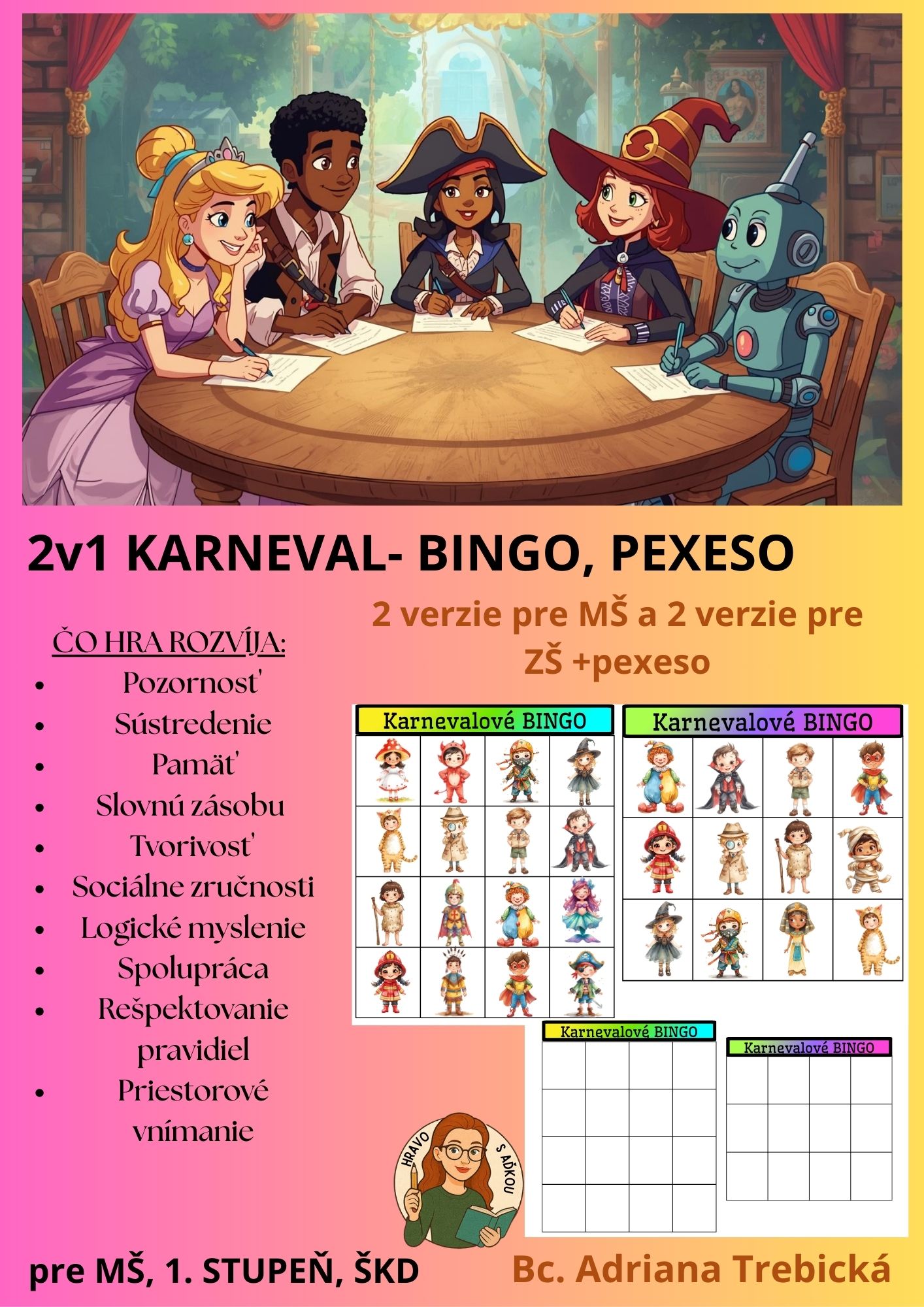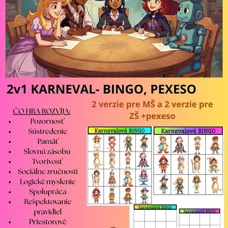 Karnevalové obrázkové bingo je zábavná edukačná hra, ktorá spája radosť z hry s rozvojom dôležitých zručností. Obsahuje ľahšiu aj náročnejšiu verziu, vďaka čomu je vhodná pre deti v materskej škole aj mladších školákov.