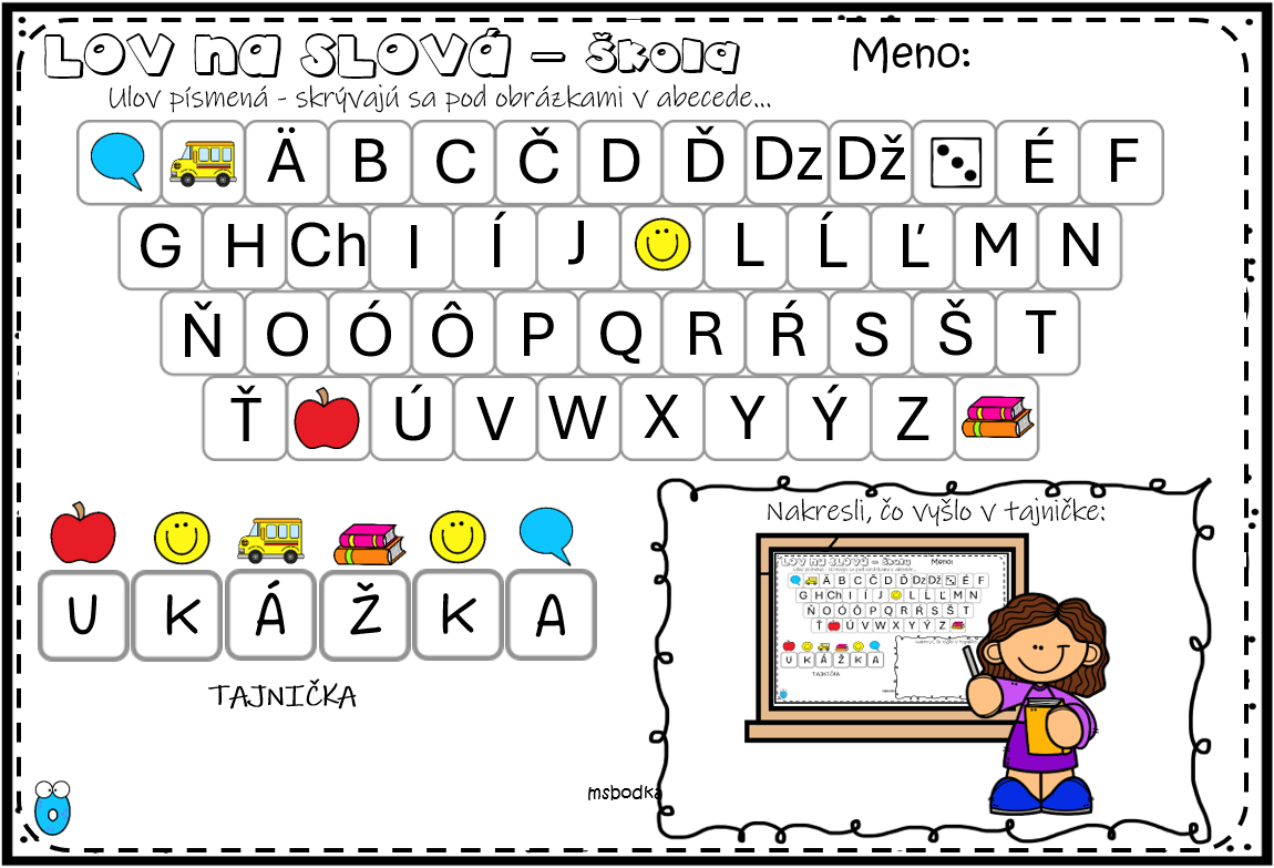 Deti pri nej „lovia“ písmená, fixujú celú slovenskú abecedu, spájajú písmená do slov a objavujú skrytý význam tajničky.