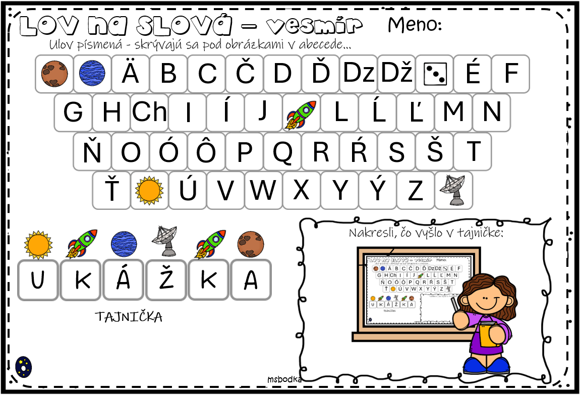 Deti pri nej „lovia“ písmená, fixujú celú slovenskú abecedu, spájajú písmená do slov a objavujú skrytý význam tajničky.