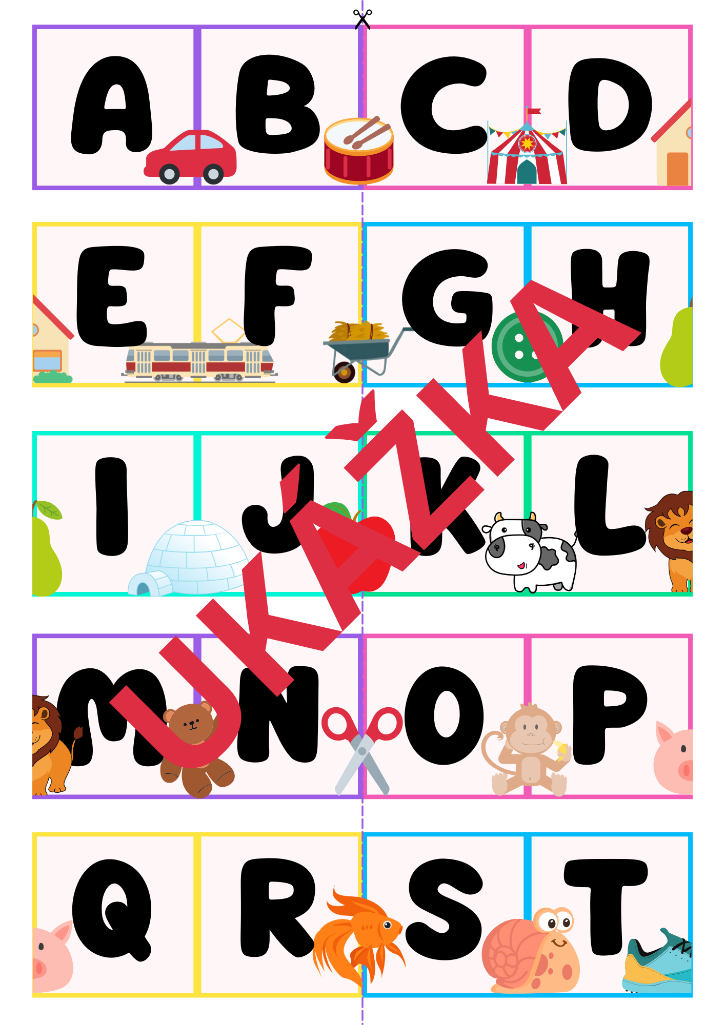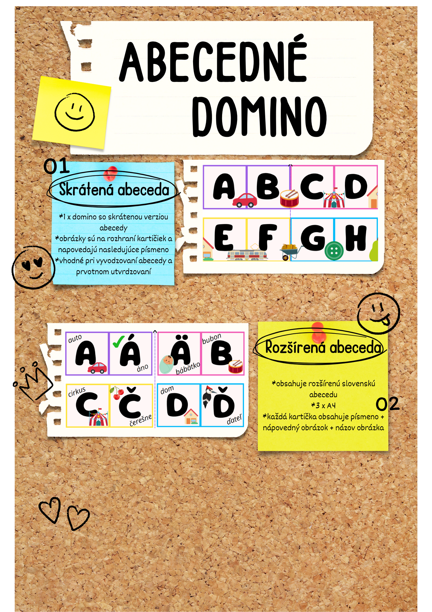 Domino na vyvodenie - Obsahuje písmená skrátenej abecedy. Žiaci vedia vyvodiť abecedné poradie písmen podľa nápovedných obrázkov. Obrázky sú na hraniciach kartičiek, takže pri vyvodení sa žiaci prvotne riadia obrázkami, ktoré spájajú dokopy. Domino je zároveň autokorektívne.