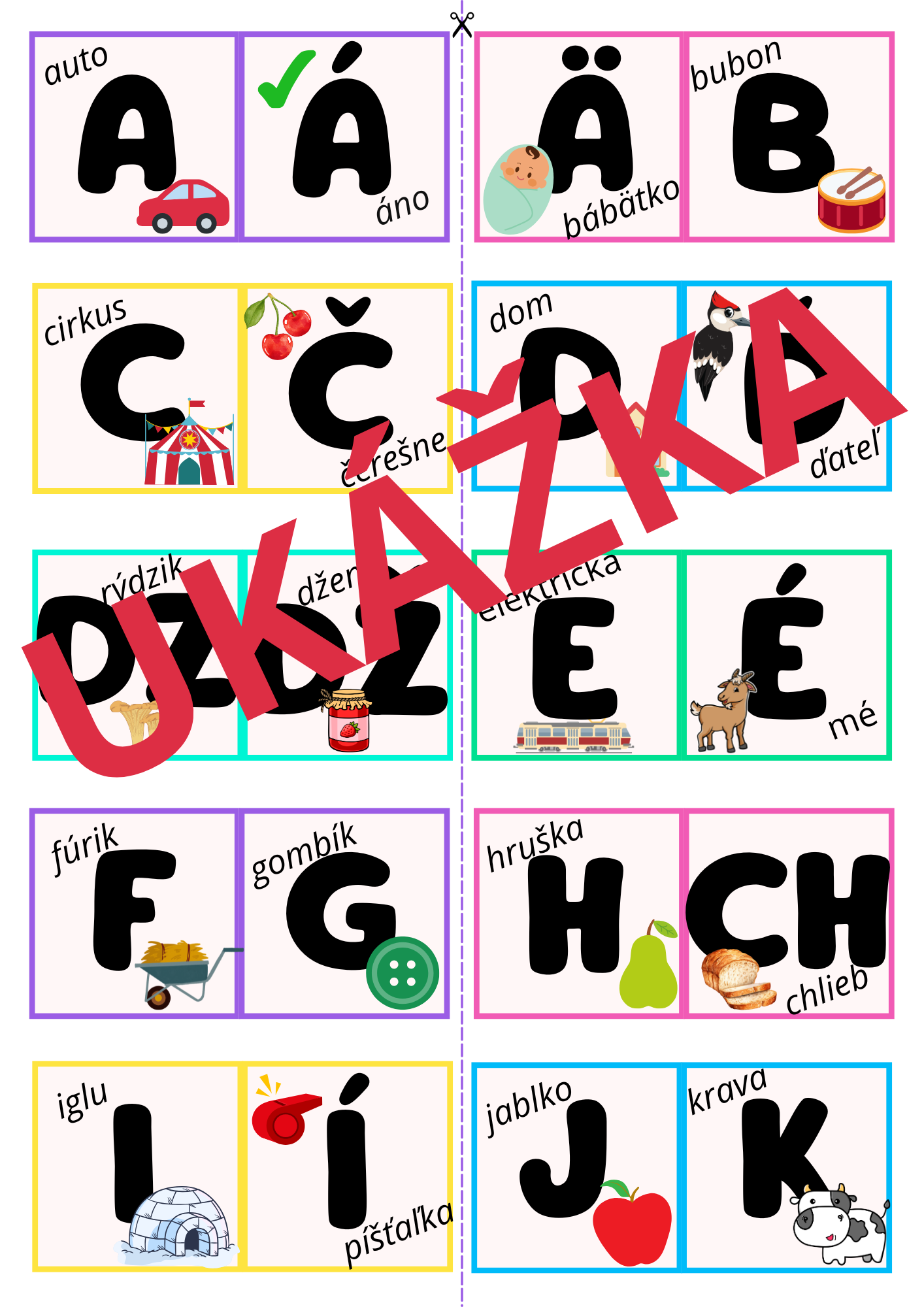 Domino na precvičenie - toto domino obsahuje všetky písmená slovenskej abecedy. Pre väčšiu atraktivitu materiálu je ku každému písmenu priradený aj nápovedný obrázok. Pre zrozumiteľnosť je ku každému písmenku a obrázku dopísané aj slovo - napr. ä - bábätko, ý - kýchať.